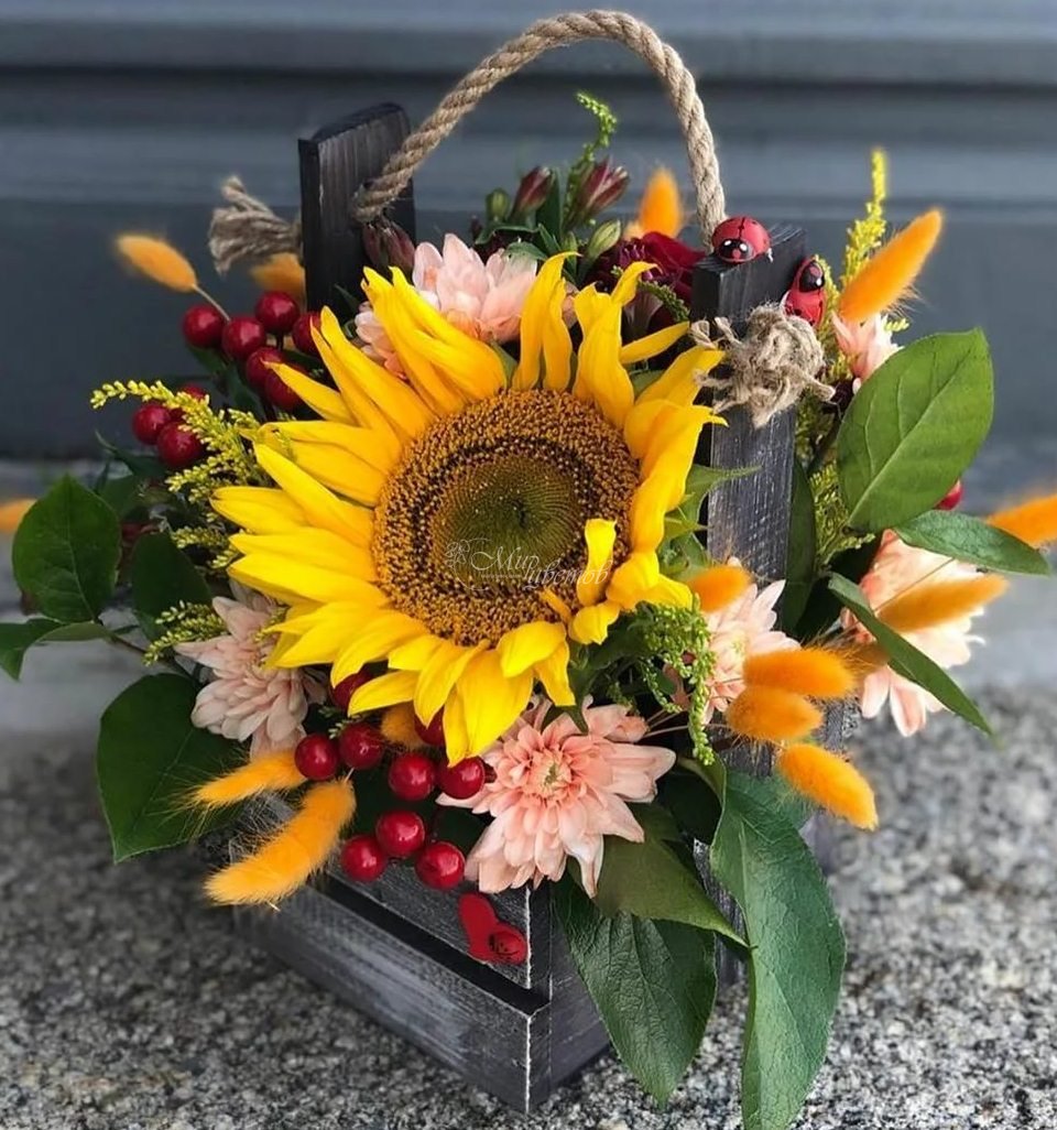 Ящик Подсолнух Декор Хризантема кустовая Хиперикум Зелень Лагурус