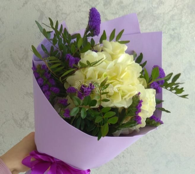 Гортензия Хризантема кустовая Хиперикум Статица Декор Пленка матовая Лента атласная