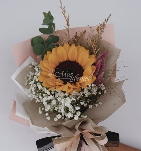 Подсолнух Гипсофила Эвкалипт Сухоцветы Бумага крафт Лента атлас