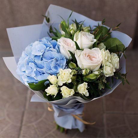 Гортензия Роза белая Роза кустовая Альстромерия Эвкалипт Фоамиран Лента атлас
