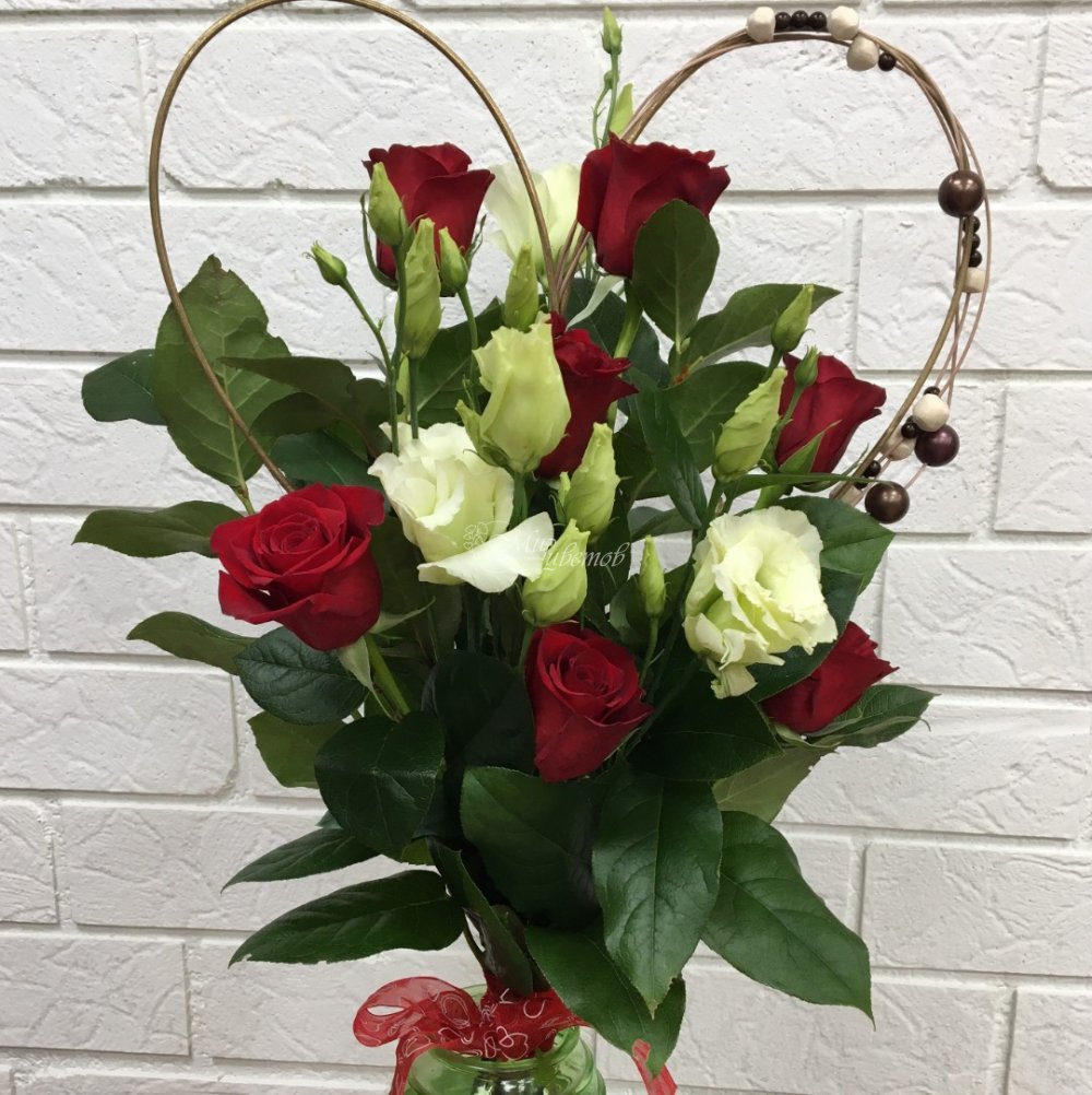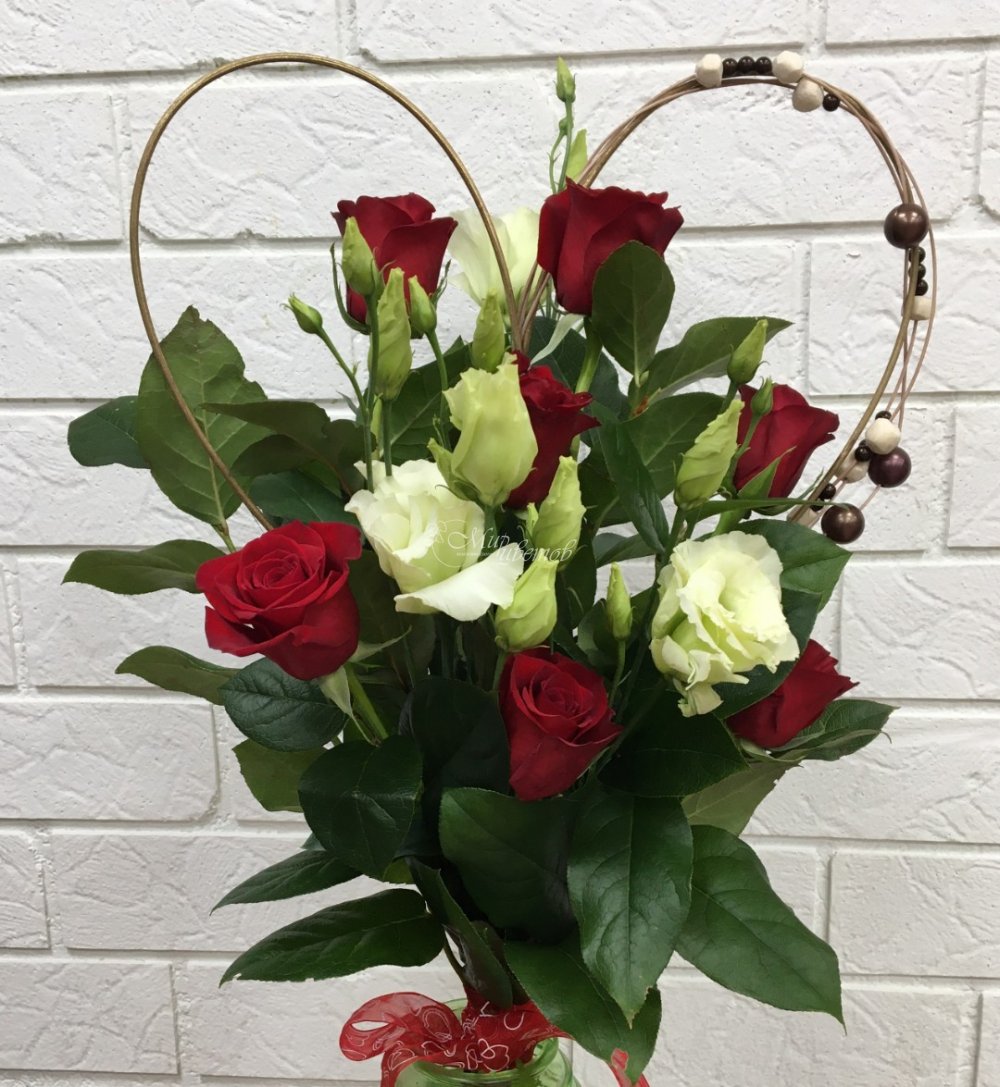 Роза Эустома Зелень Каркас в виде "Сердца" Лента атлас