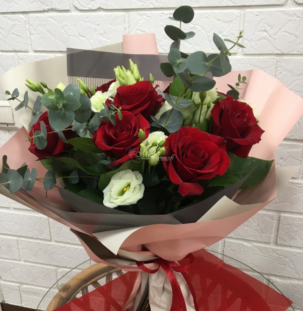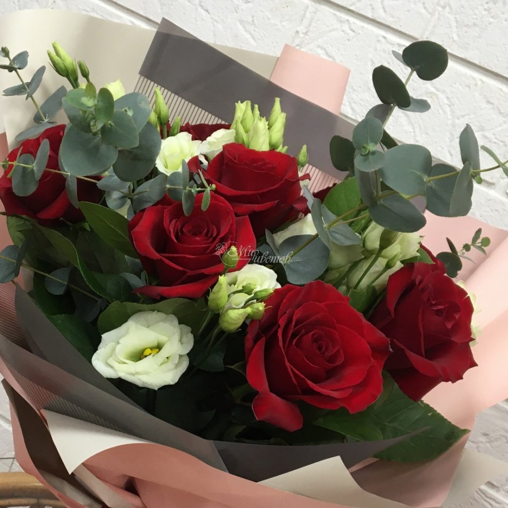 Роза бордовая Эустома Эвкалипт Зелень Упаковка Лента атлас
