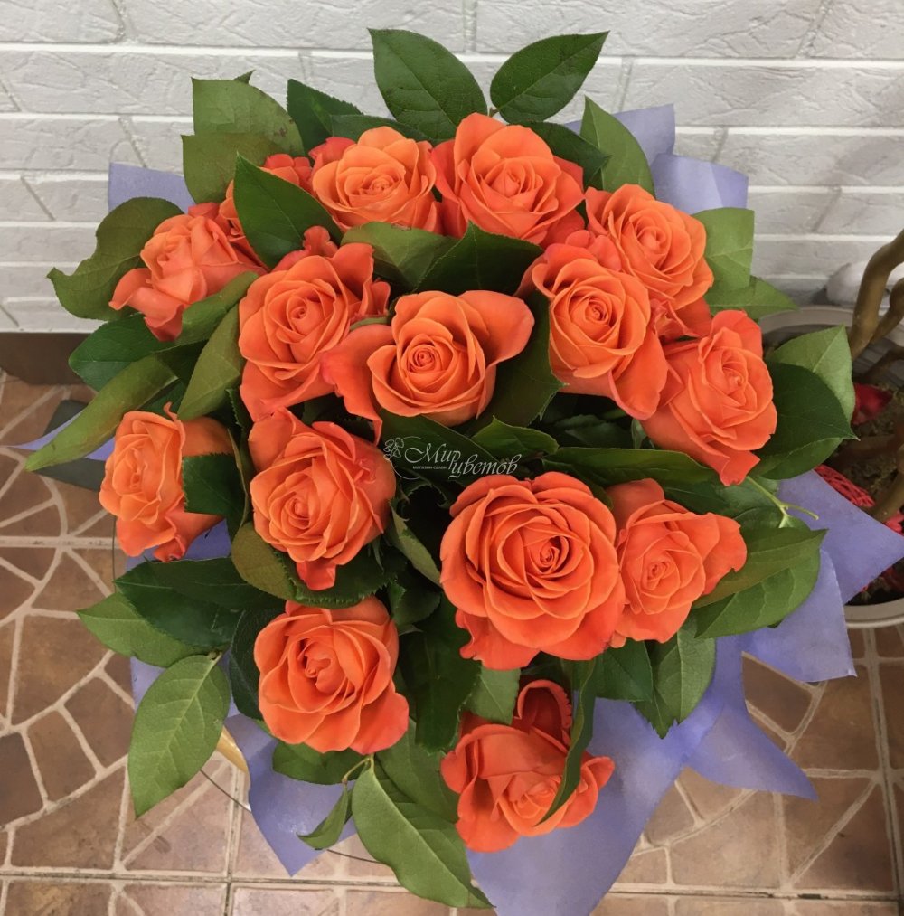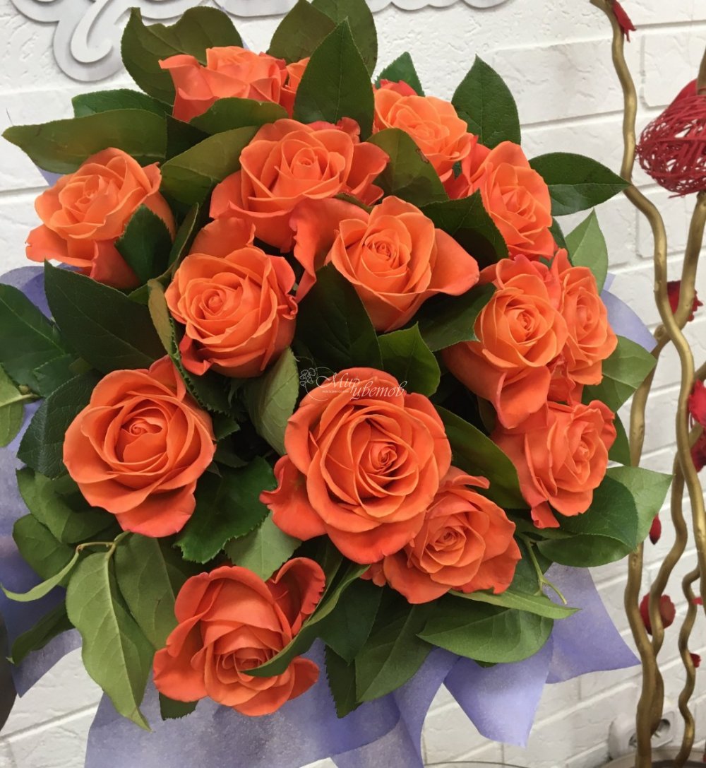 Роза оранжевая Зелень Упаковка фетр Лента атлас