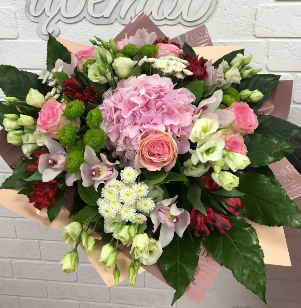 Гортензия Роза Цимбидиум Альстромерия Эустома Хризантема кустовая Фатсия Зелень Упаковка пленка матовая лента
