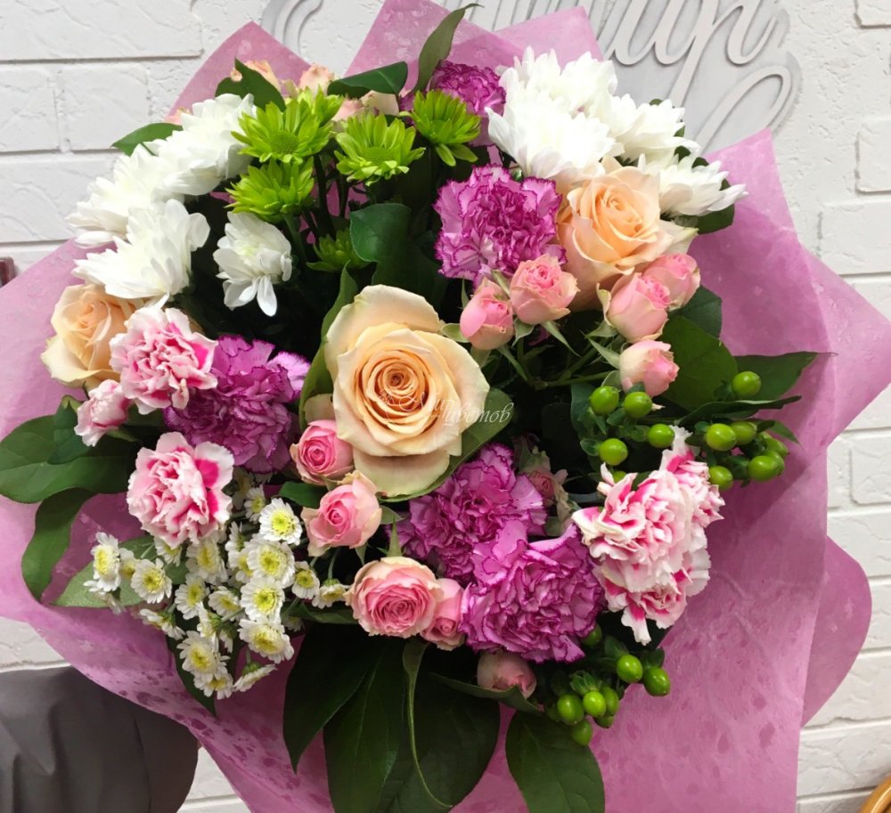 Роза Роза кустовая Хризантема кустовая Гвоздика кустовая Гвоздика одгоголовая Гиперикум Зелень Упаковка фетр Лента атлас