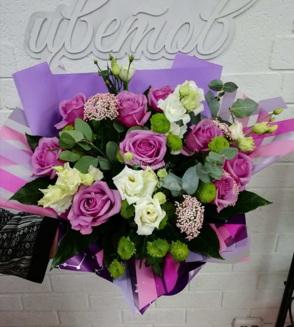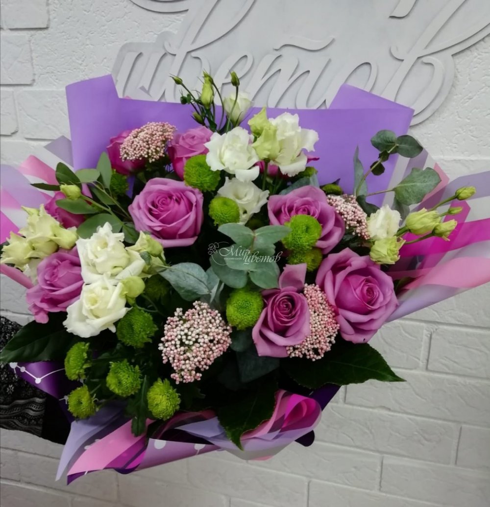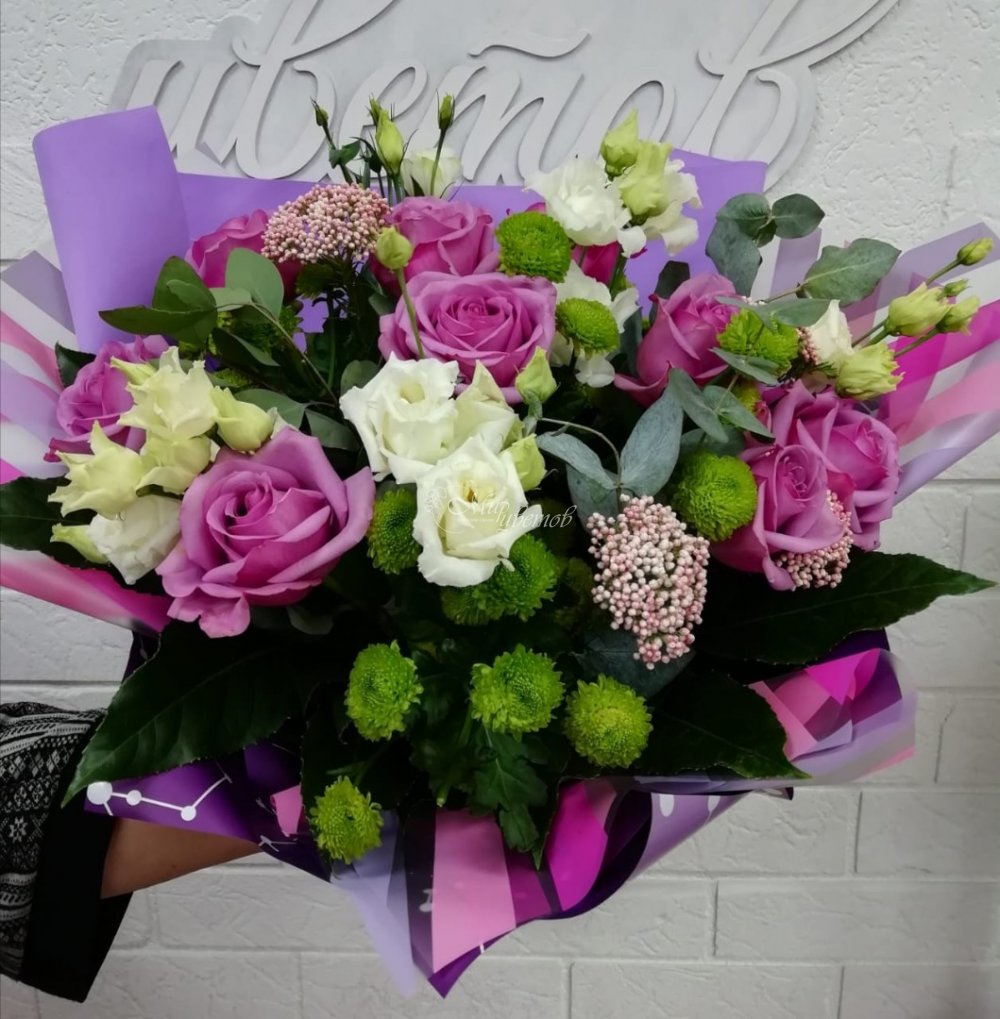Хризантема кустовая - -3 шт Альстромерия - 2 шт Роза - 5 шт Зелень Пленка матовая Лента атлас