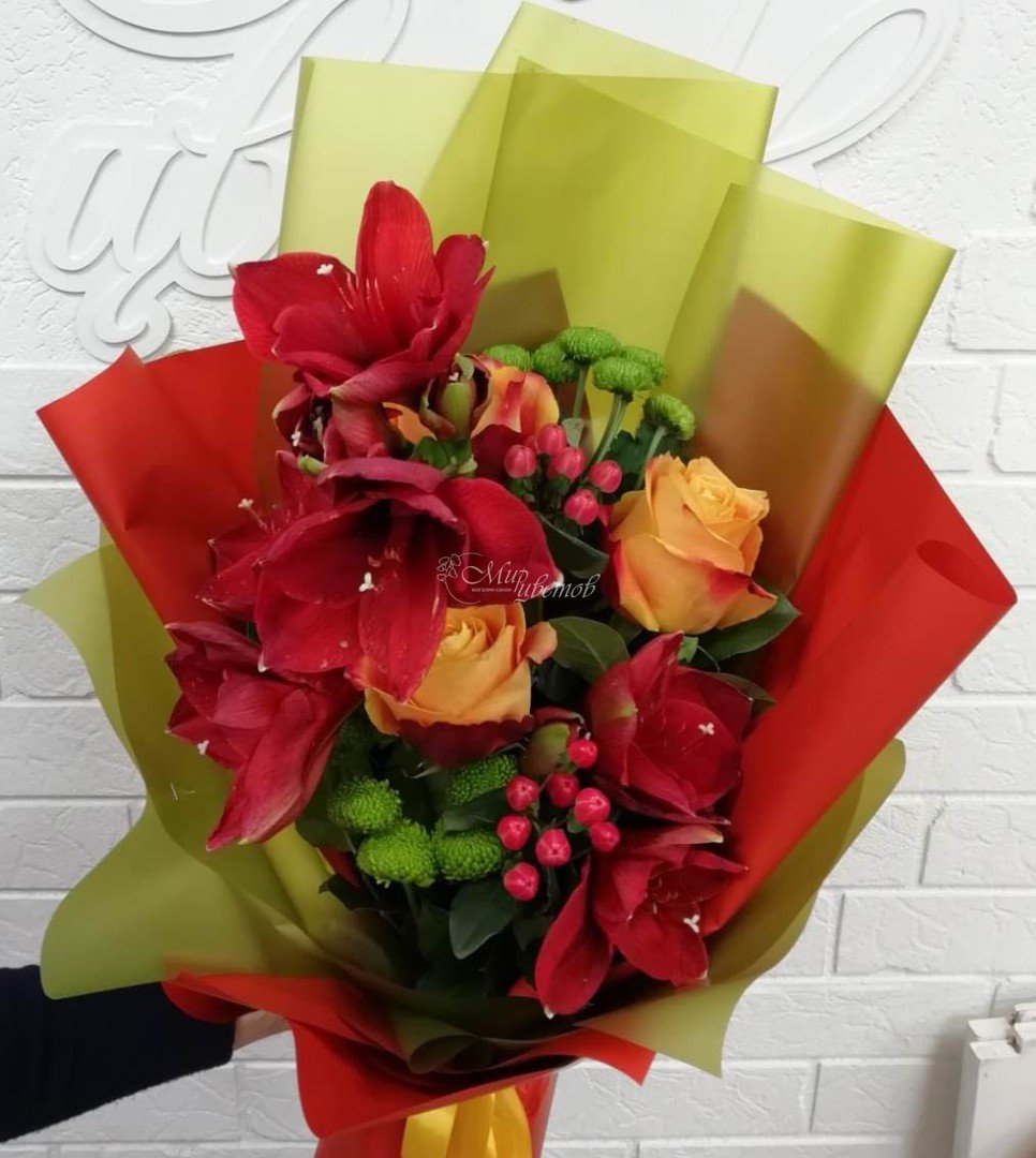 Амарилисы Розы Хиперикум Хризантема кустовая Зелень Матовая пленка Лента атлас