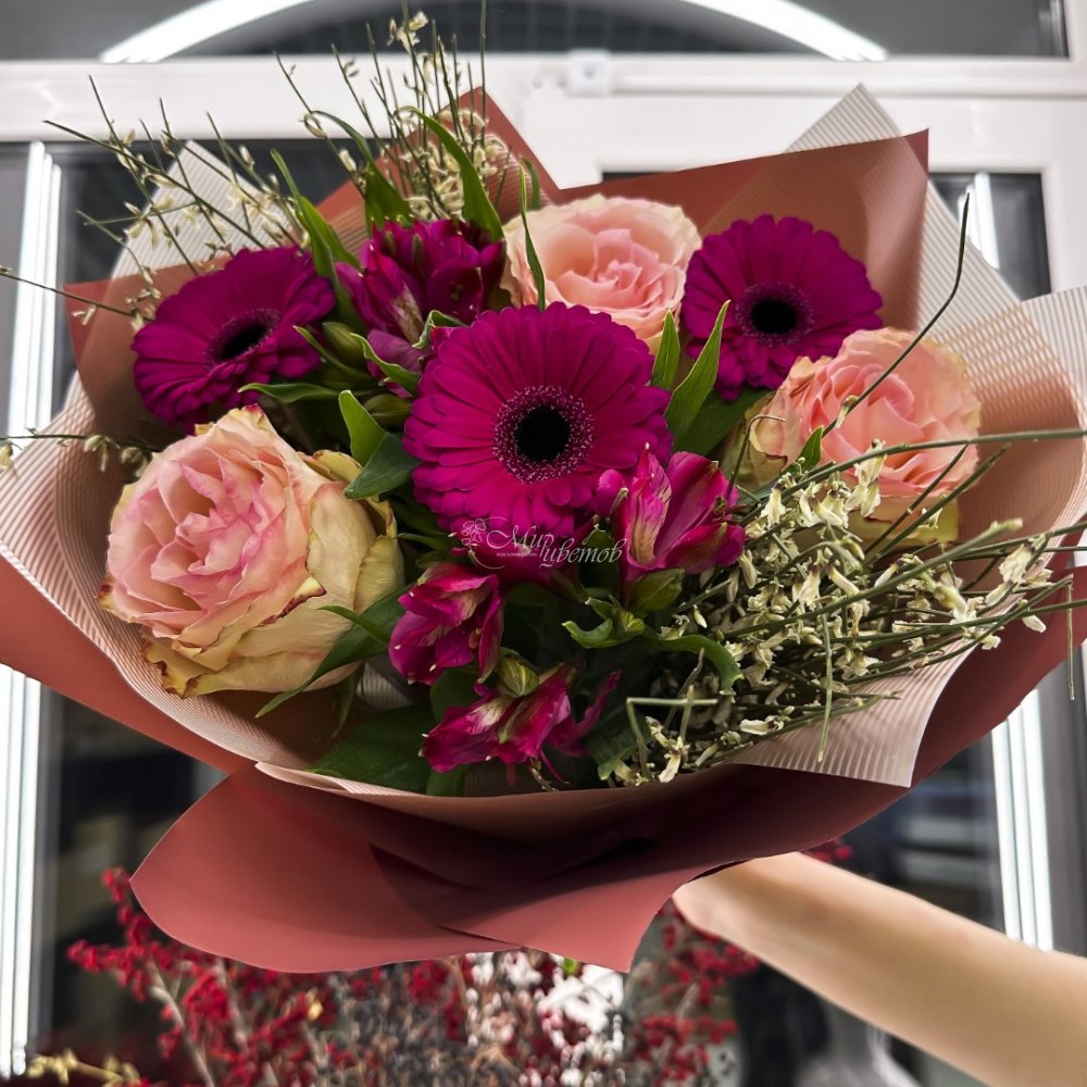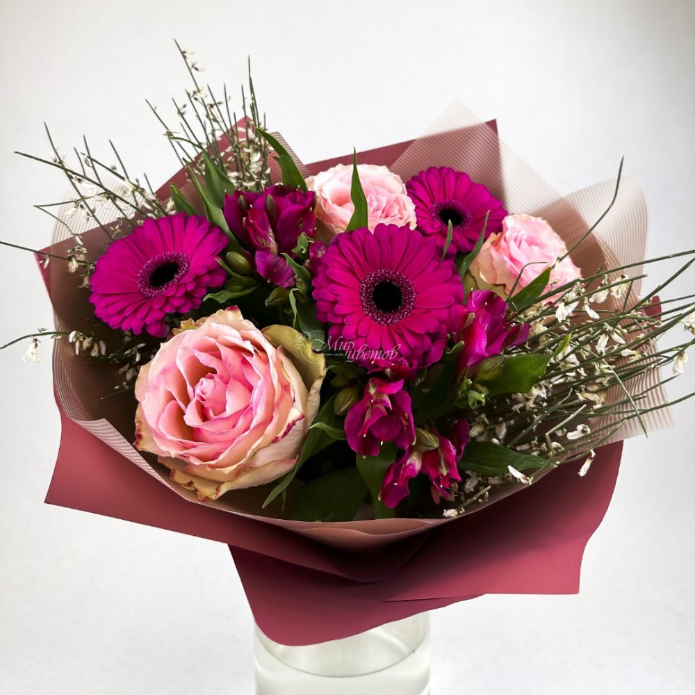 Букет из розовых роз, альстрометрии и эустомы не оставит равнодушным
