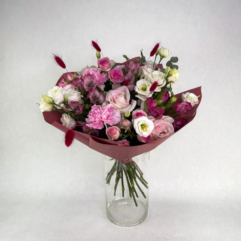 Розы Эустомы Гвоздики Кустовые розы Альстромери Пленка матовая Лента атлас