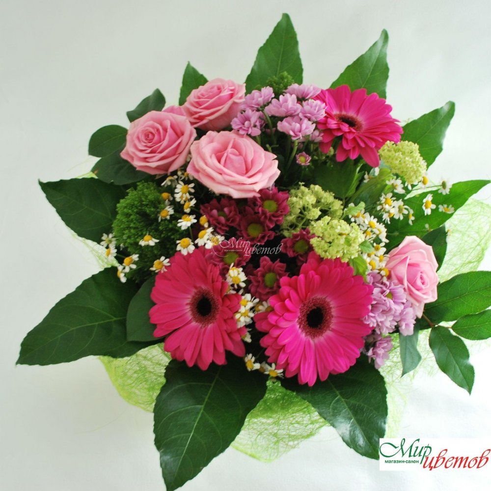 Розы Кустовые розы Герберы Альстромерии Гвоздики Зелень Пленка матовая Лента атлас