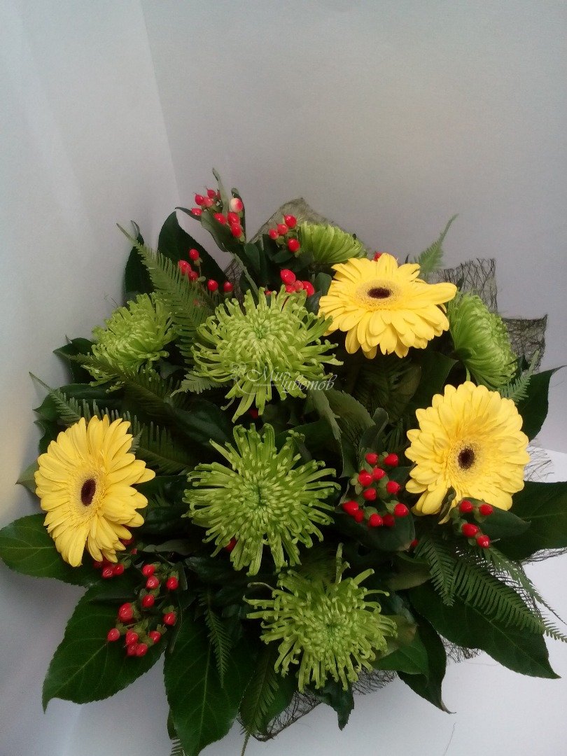 Хризантема Гербера Гиперикум Салал Фатсия Упаковка сизаль Лента атлас