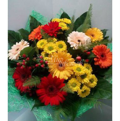 Гербера Хризантема кустовая Гиперикум Умбрела Статица Салал фатсия Упаковка фетр Лента атлас