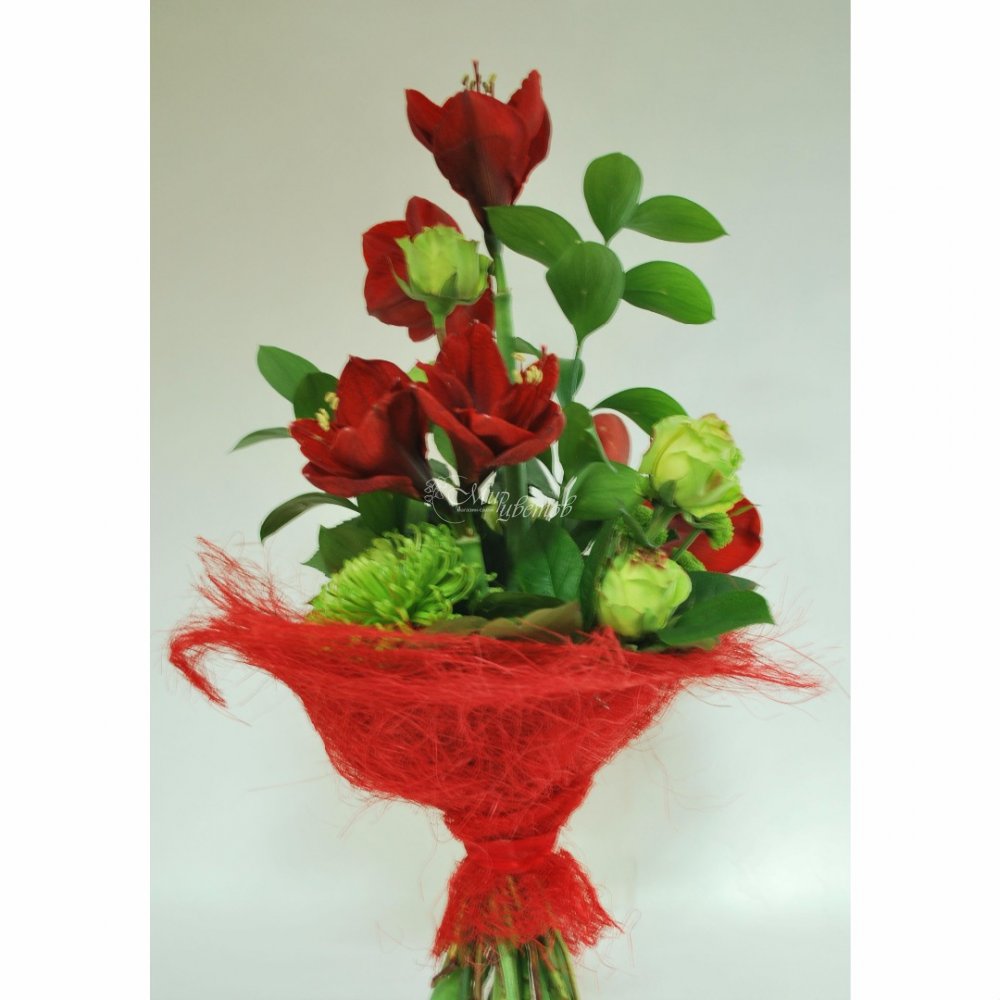 Амариллис - 3 шт Роза - 3шт Хризантема - 4 шт Рускус - 3 шт Салал Упаковка сизаль Лента атлас