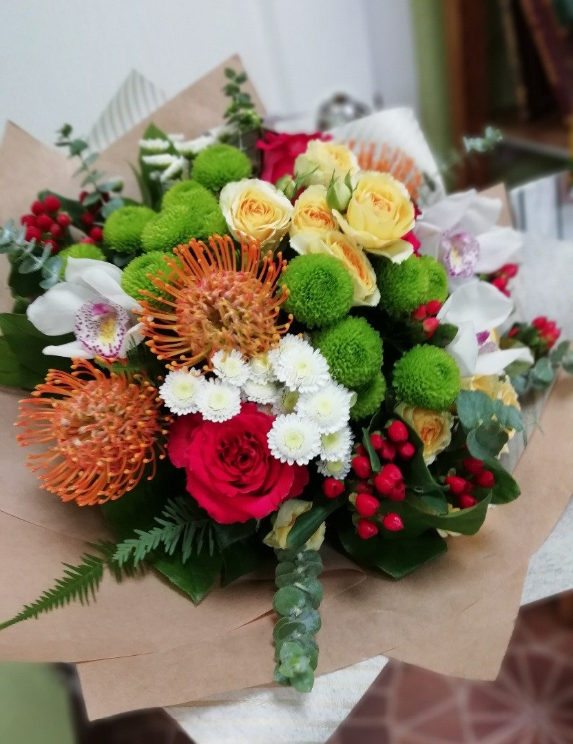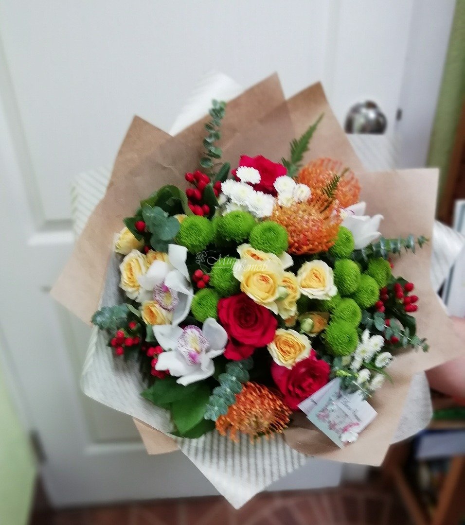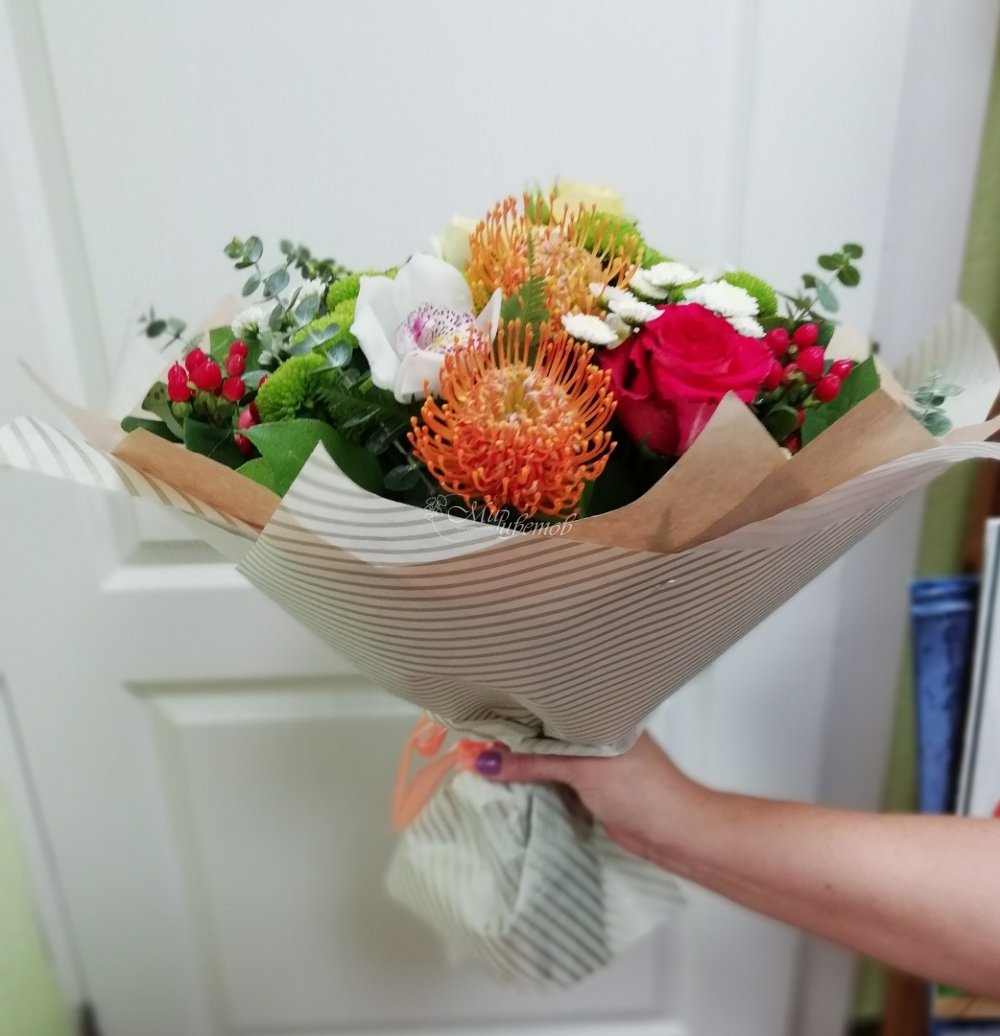 Роза леукосперикум гиперикум эвкалипт хризантема цимбидиум упаковка лента