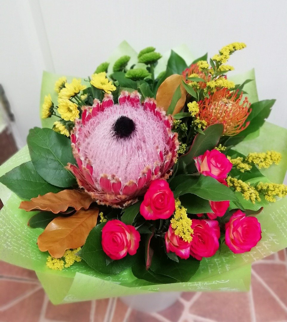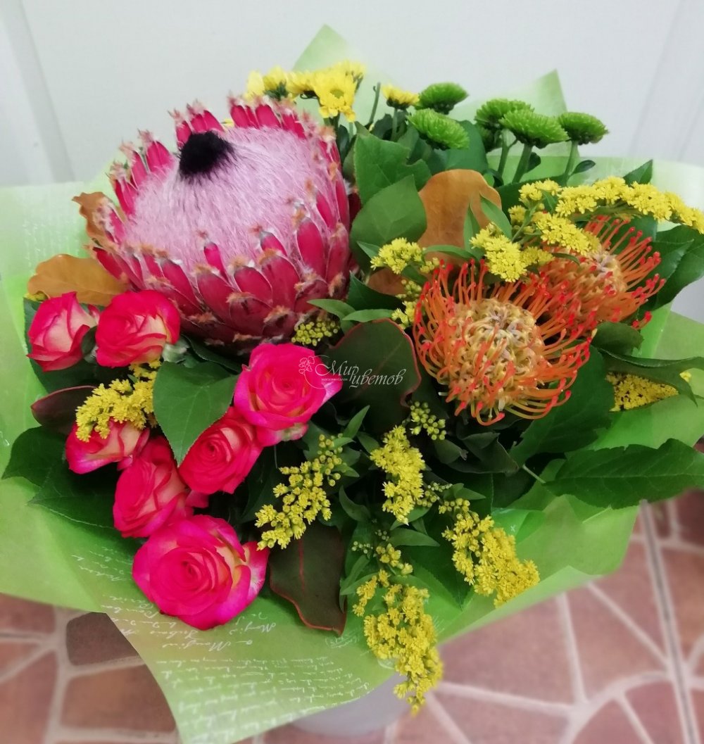 Протея леукосперикум хризантема роза кустовая зелень упаковка лента атлас