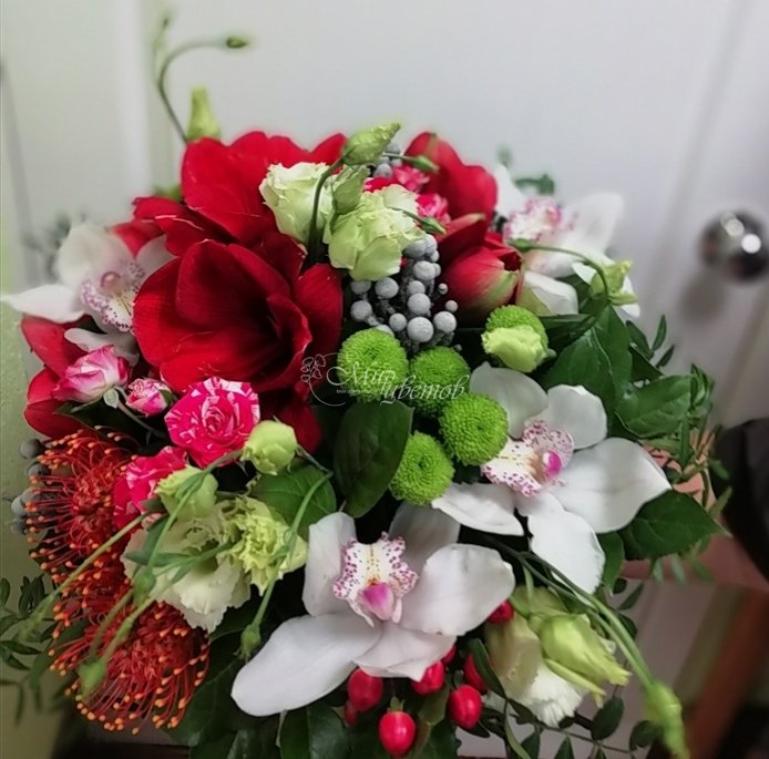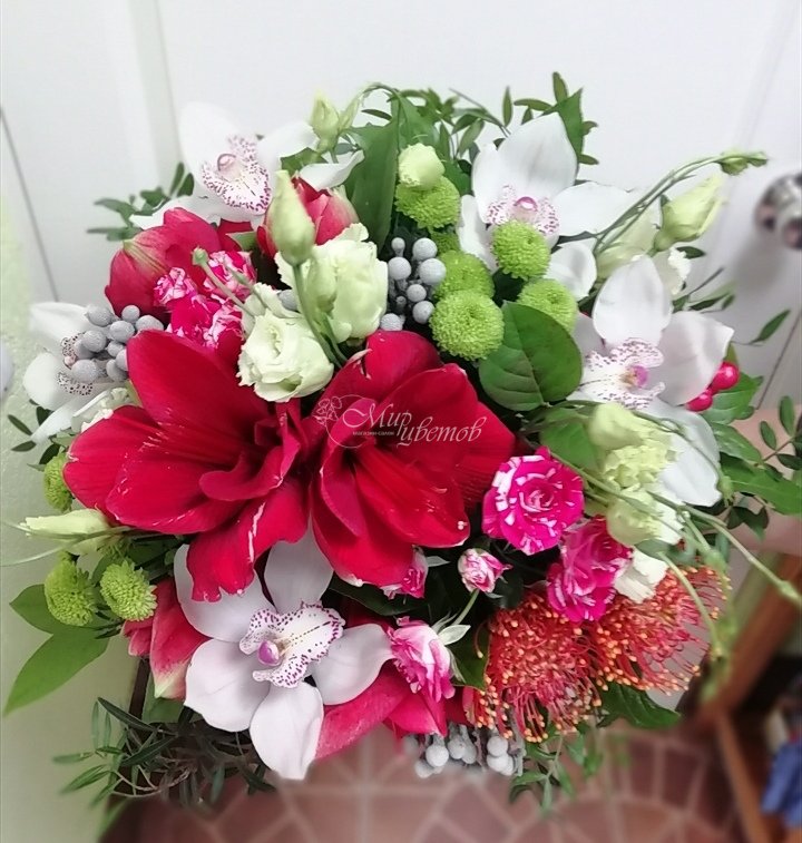 Амарилис Цимбидиум Леукоспермум Скимия Эустома Хризантема кустовая Гиперикум Бруния Фисташка Зелень Упаковка сизаль Лента атлас