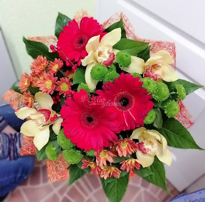 Гербера Цимбидиум Хризантема кустовая Зелень фатсия Упаковка Лента атлас