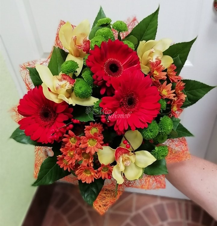 Гербера Хризантема кустовая Гиперикум Умбрела Статица Салал фатсия Упаковка фетр Лента атлас