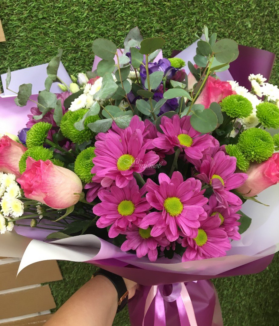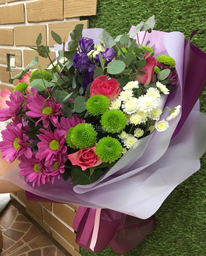 Роза Эустома Озатамнус Эвкалипт Зелень Хризантема кустовая Упаковка Лента