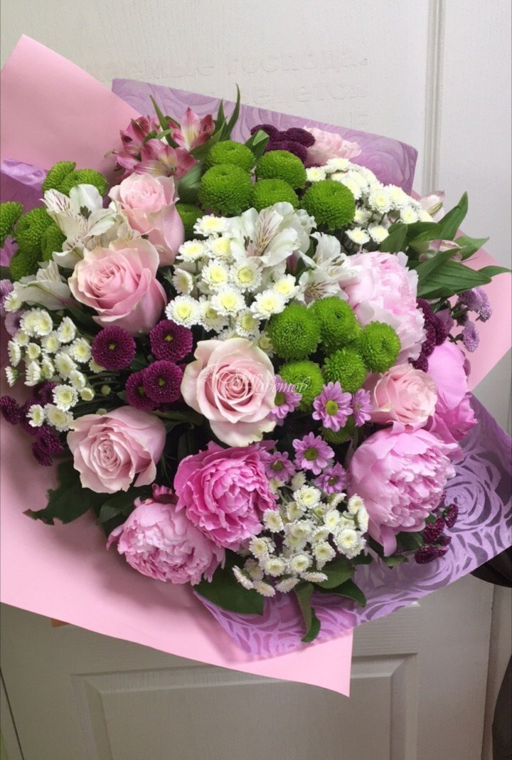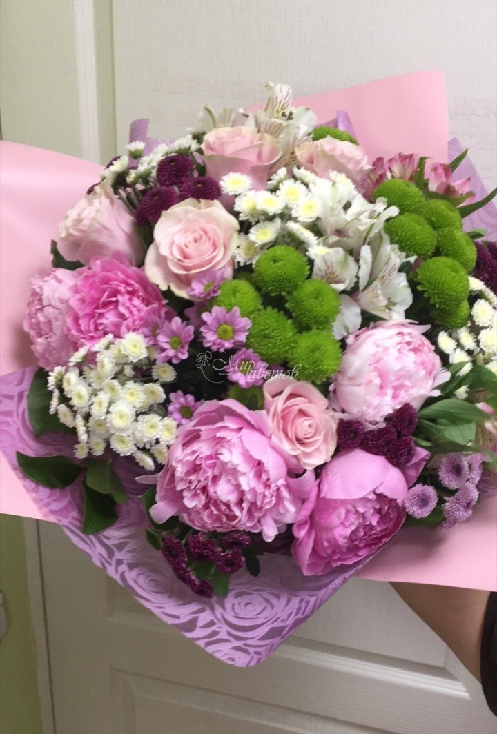 Пионы Роза Хризантема кустовая Альстромерия Зелень Упаковка Лента атлас