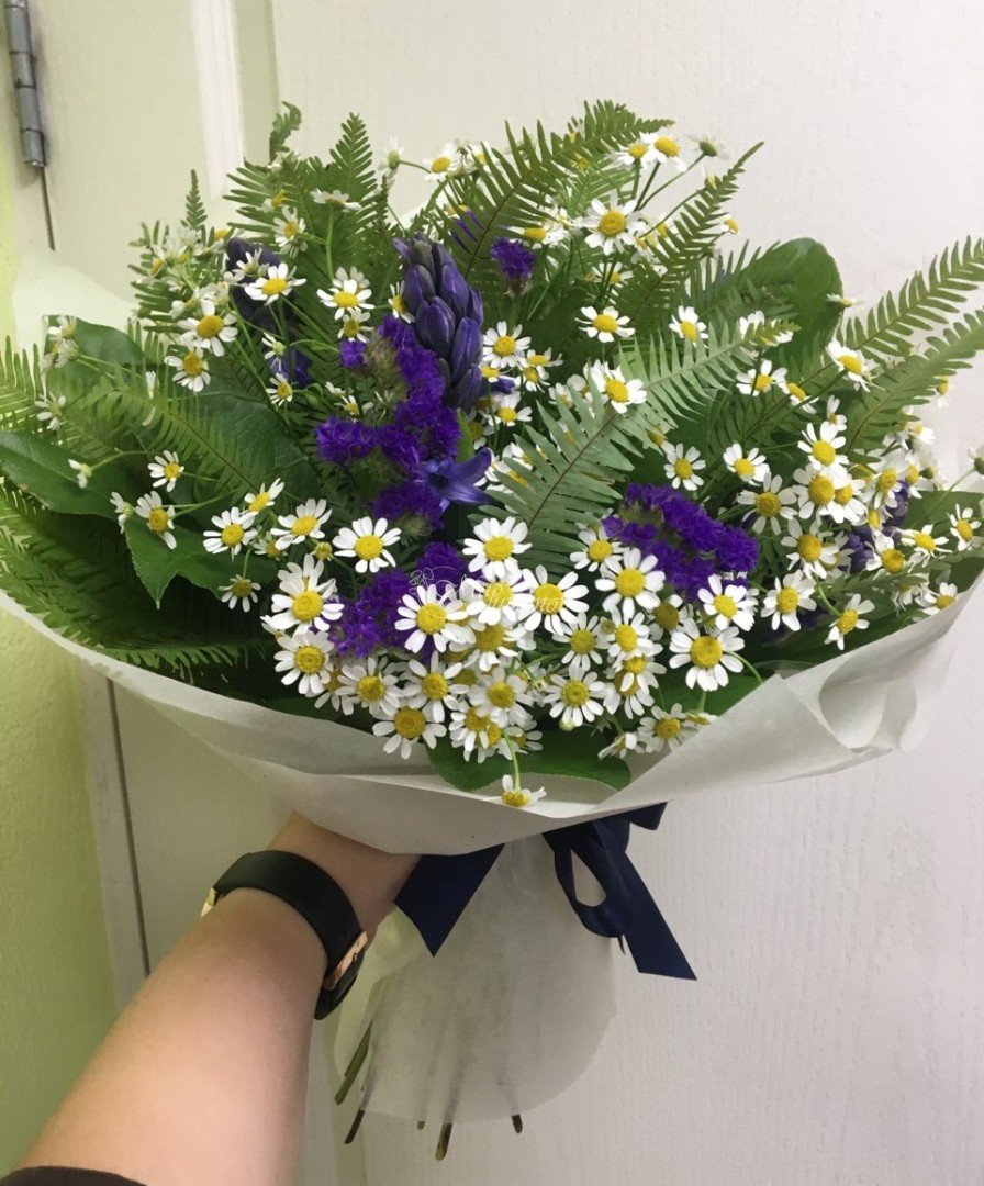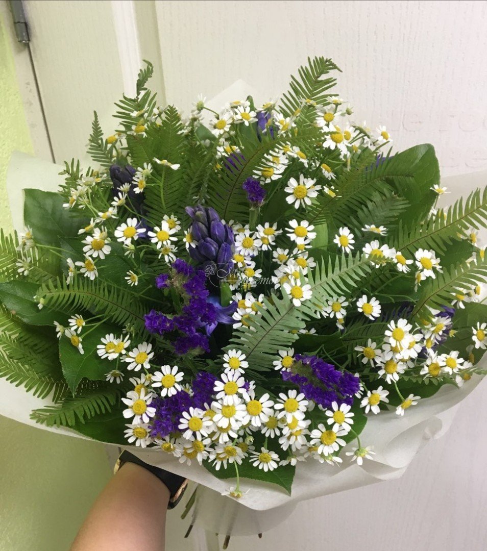 Танацетум - 11 шт Гиацинт - 3 шт Умбрела Статица Зелень Упаковка Лента атлас