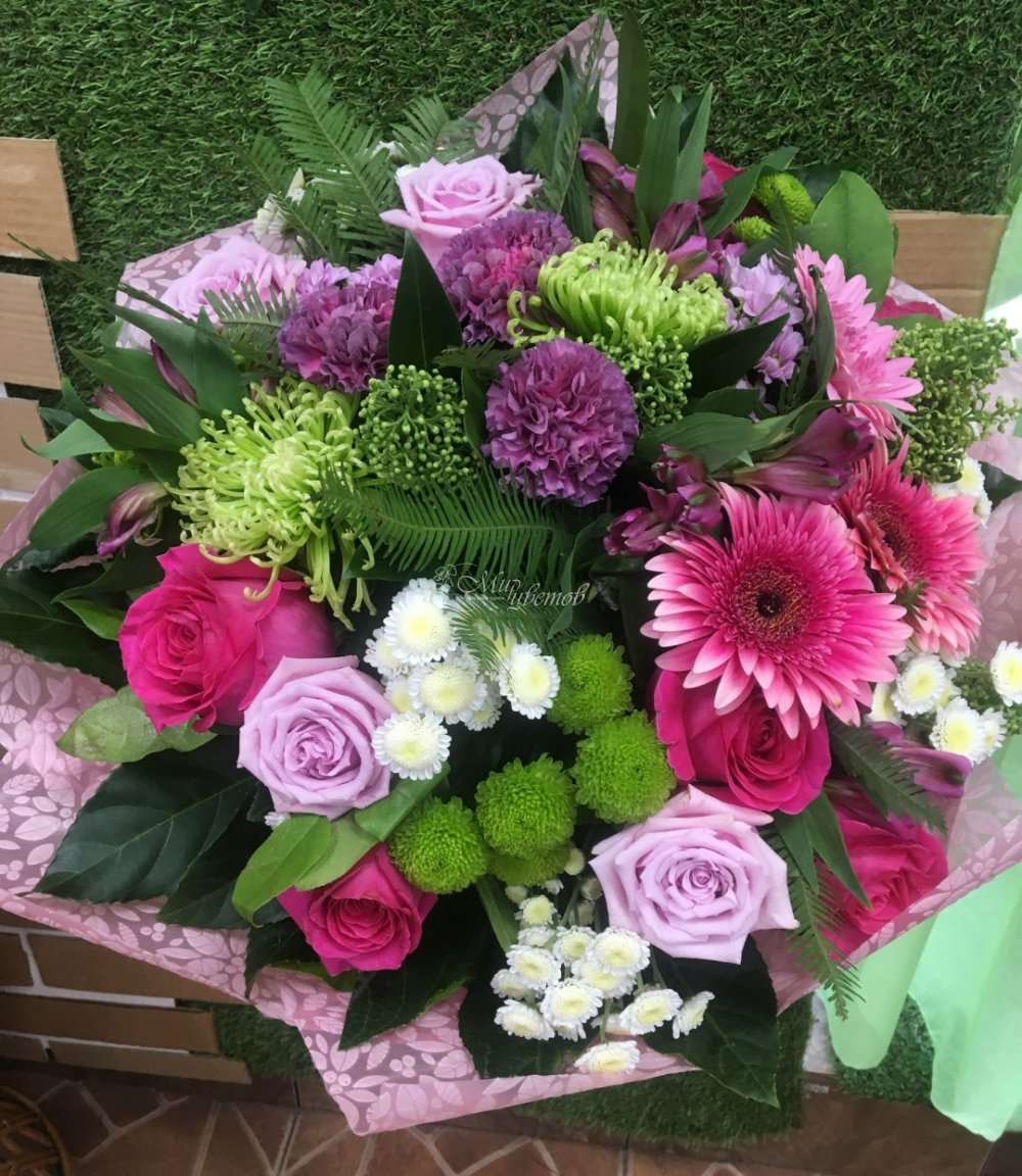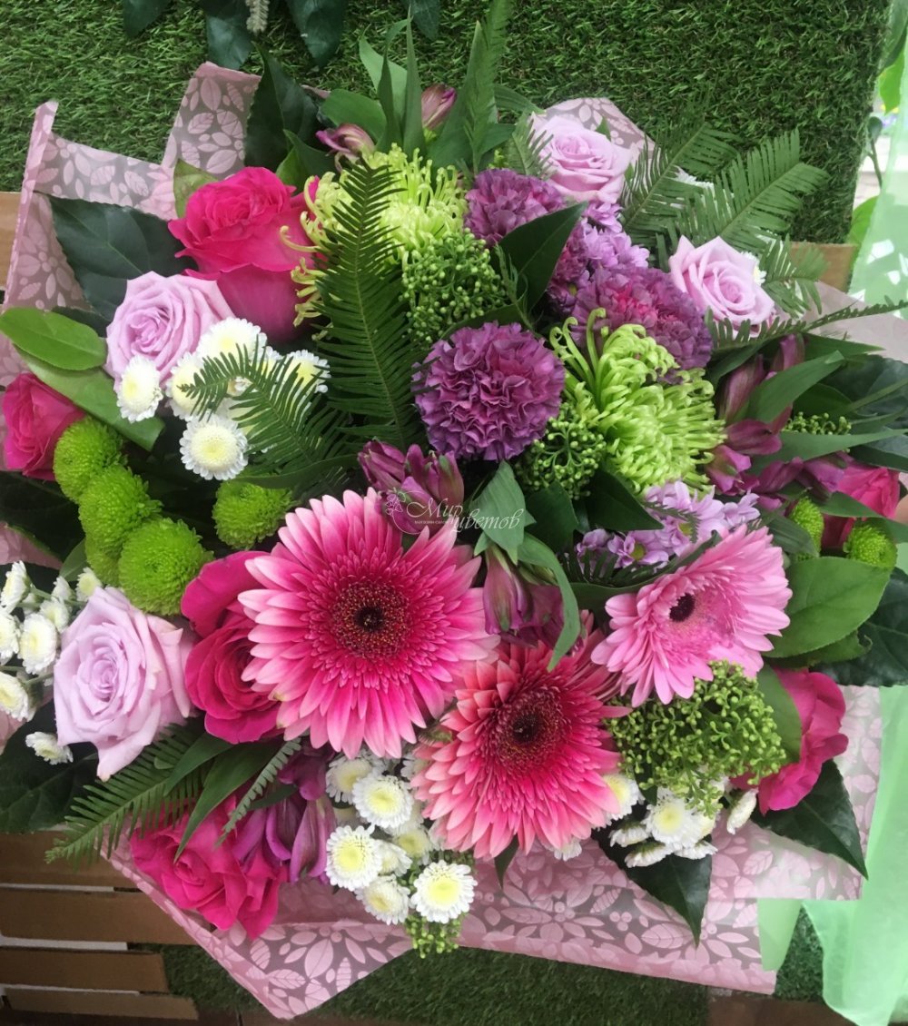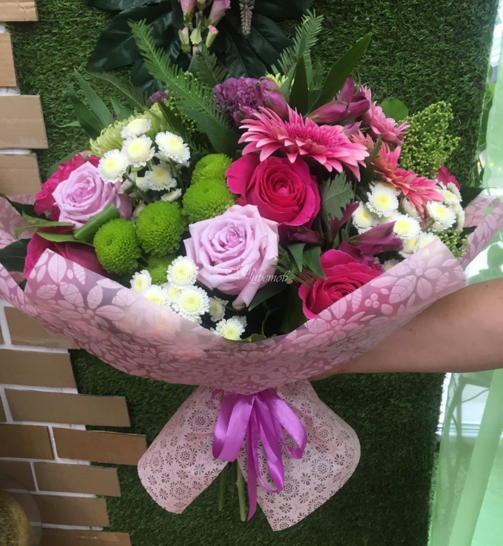 Алиум Гербера Хризантема кустовая Матиола Альстромерия Гвоздика Зелень Упаковка Лента аитлас