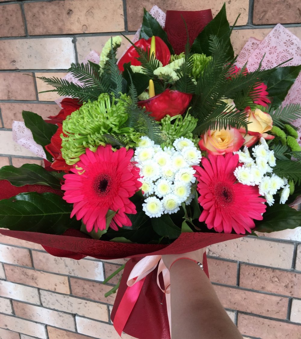 Амарилис Антуриум Гербера Хризантема кустовая Хризантема одноголовая Роза Умбрела Зелень Фатсия Упаковка Лента атлас