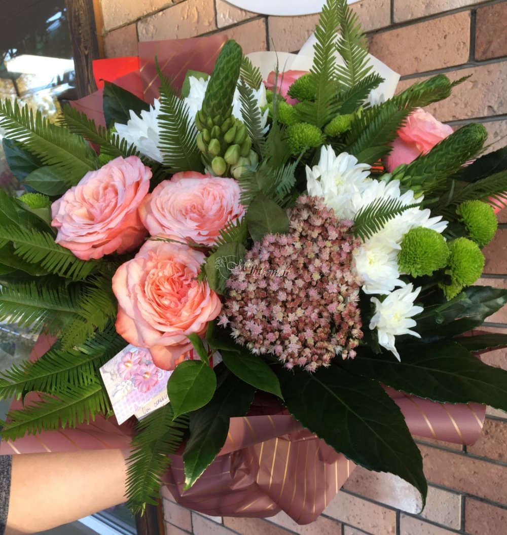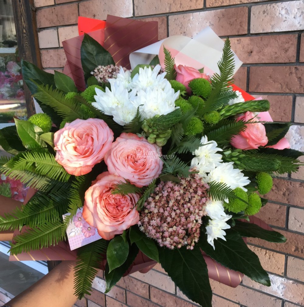 Роза розовая Орнитиогалум Седум Хризантема кустовая Умбрела Зелень Упаковка Лента атлас
