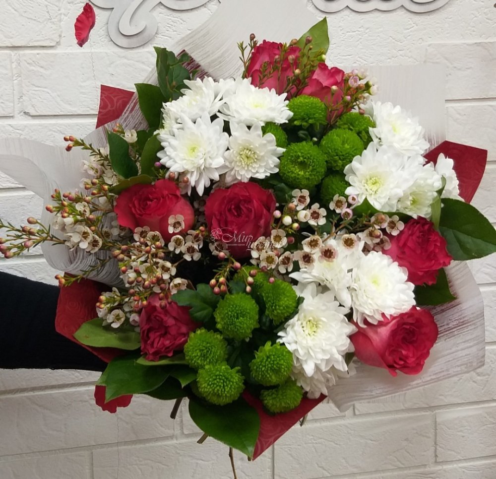 Хризантема кустовая - 2 шт Альстромерия - 2 шт Роза - 3 шт Зелень Пленка матовая Лента атлас