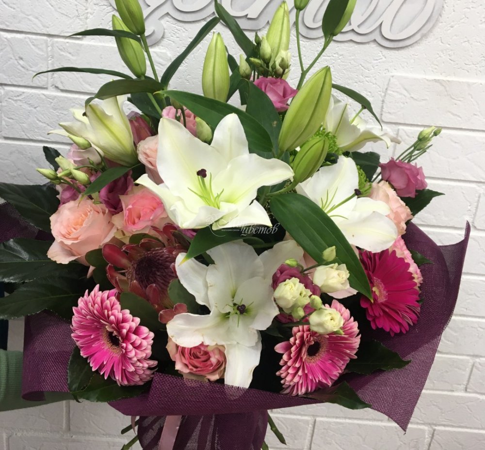 Лилия Эустома Роза Протея Гербера Хризантема Трахелиум Фатсия Упаковка джут Лента атлас