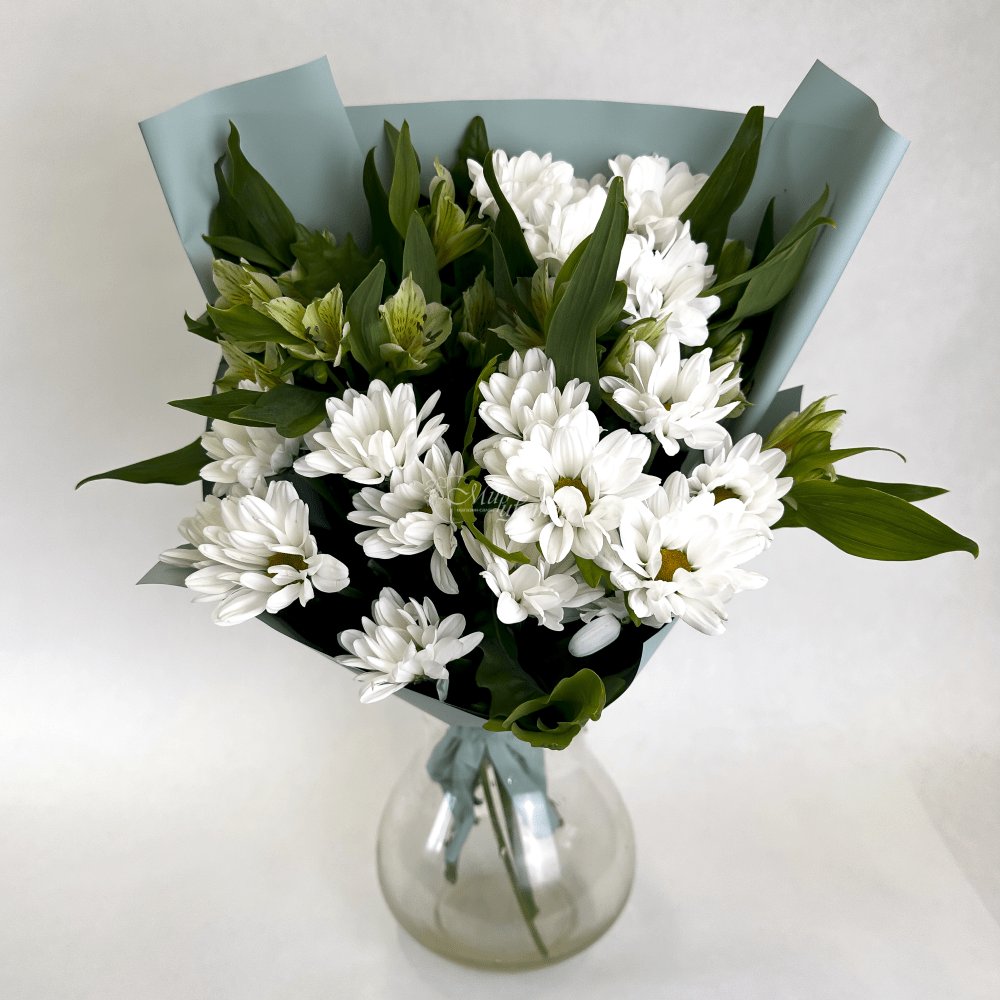 Хризантема кустовая - 2 шт Альстромерия - 2 шт Роза - 3 шт Зелень Пленка матовая Лента атлас