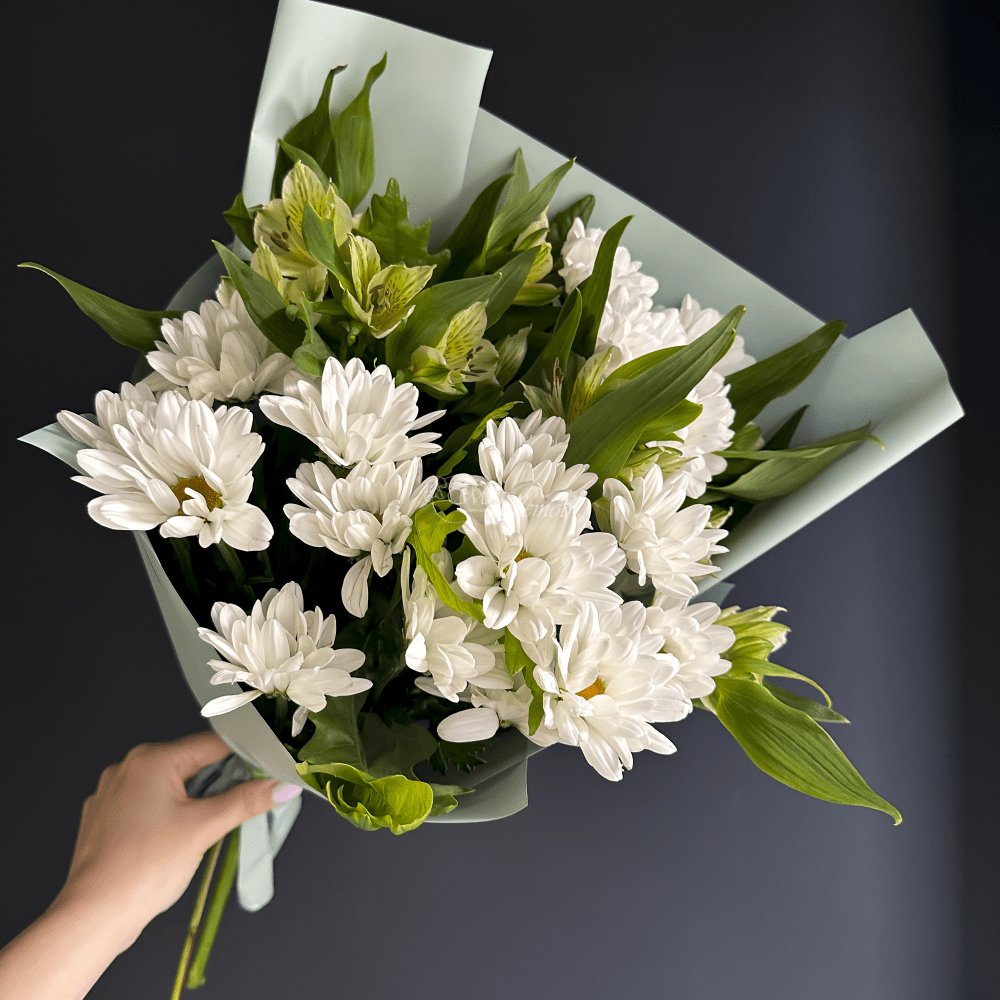 Хризантема кустовая - -3 шт Альстромерия - 2 шт Роза - 5 шт Зелень Пленка матовая Лента атлас