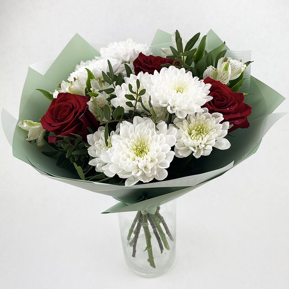 Хризантема кустовая - 2 шт Альстромерия - 2 шт Роза - 3 шт Зелень Пленка матовая лента атлас