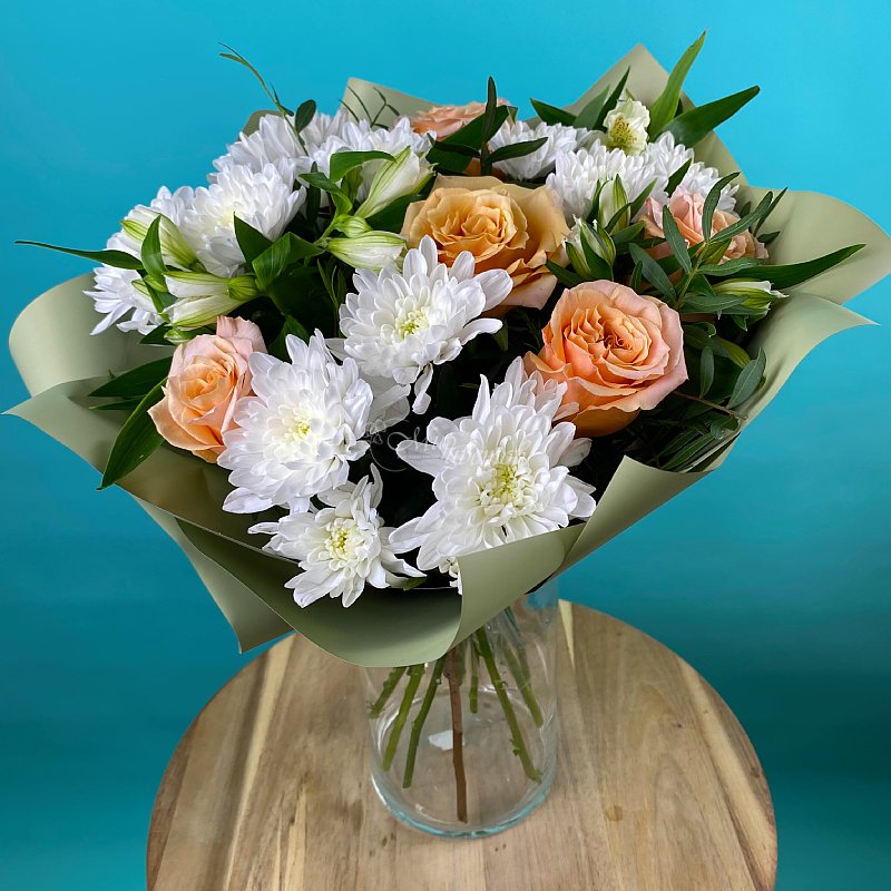 Отличное сочетание розы и хризантемы в одном букете