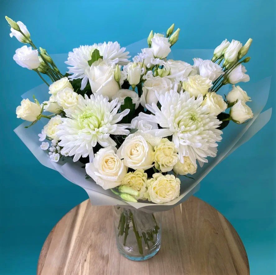 Оригинальное решение букет из белых хризантем
