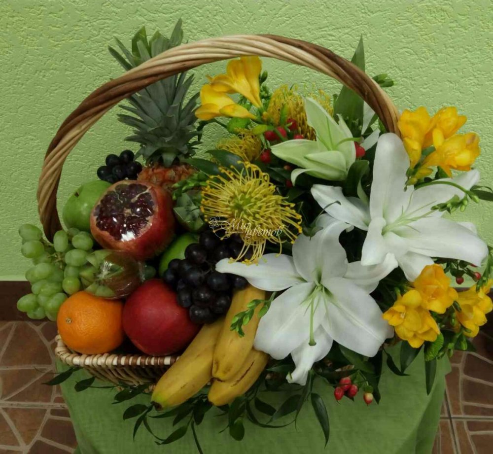 Корзина - 1шт Наполняемость фруктами взависимости от вашего пожелания Лилия - 1шт Фрезия - 4 шт Леукоспермум - 3 шт Гиперикум - 2 шт Хризантема кустовая - 2 шт Зелень