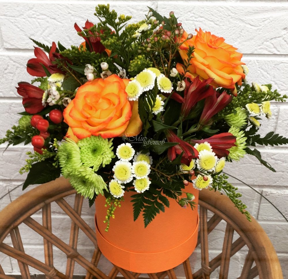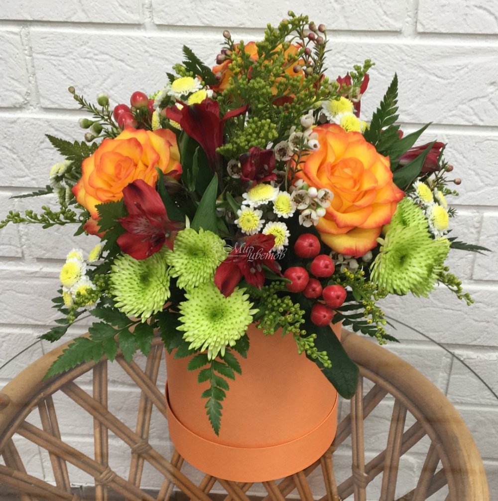 Коробка Роза Гиперикум Альстромерия Солидага Хризантема кустовая Зелень Цветы в композиции могут быть заменены на равноценные, по усмотрению флориста.