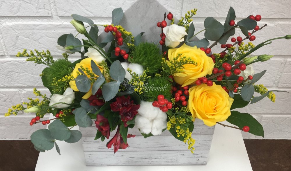 Конверт Роза Илекс Альстромерия Хлопок Гвоздика