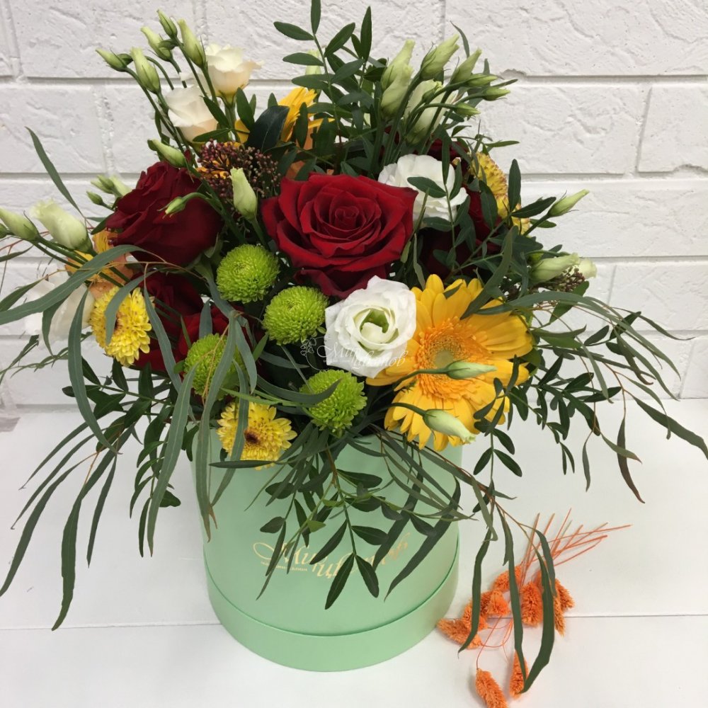 Коробка Роза Гербера Хризантема кустовая Эустома Скимия Эвкалипт Фисташка