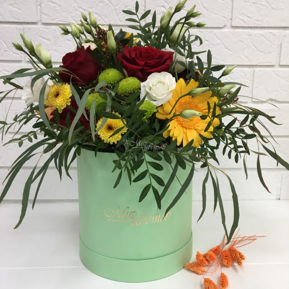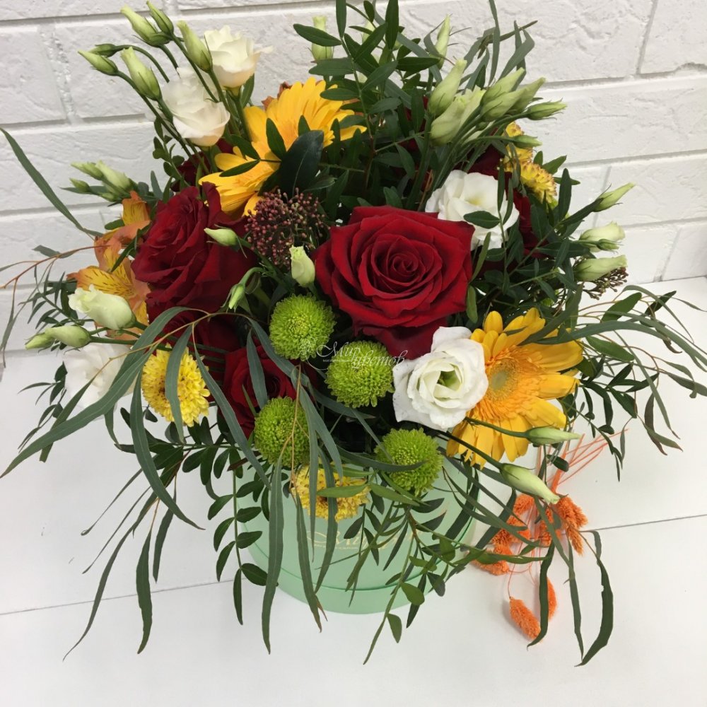 Ящик Роза - 3 шт Хризантема кустовая - 2 шт Гиперикум - 1 шт Эустома - 2 шт Салал Цветы в композиции могут быть заменены на равноценные, по усмотрению флориста.