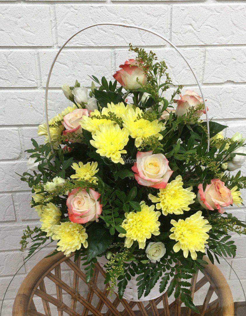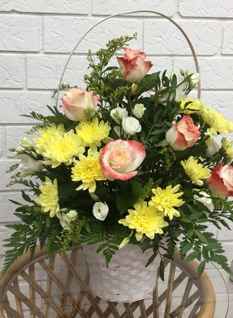 Корзина Роза Хризантема кустовая Эустома Солидага Зелень