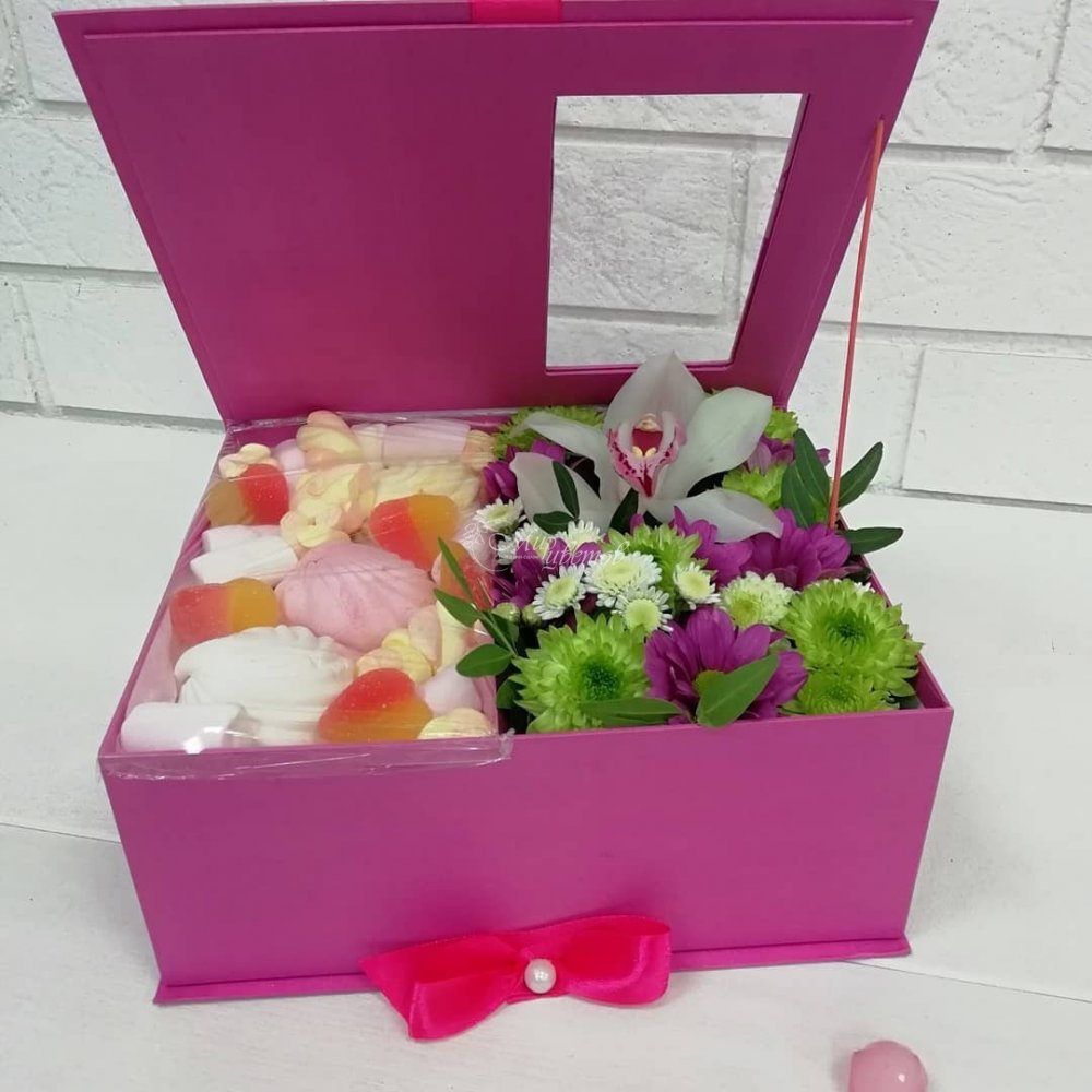 Коробка Зефирки, мармелад (по желанию можно заменить) Орхидея Хризантема кустовая Фисташка