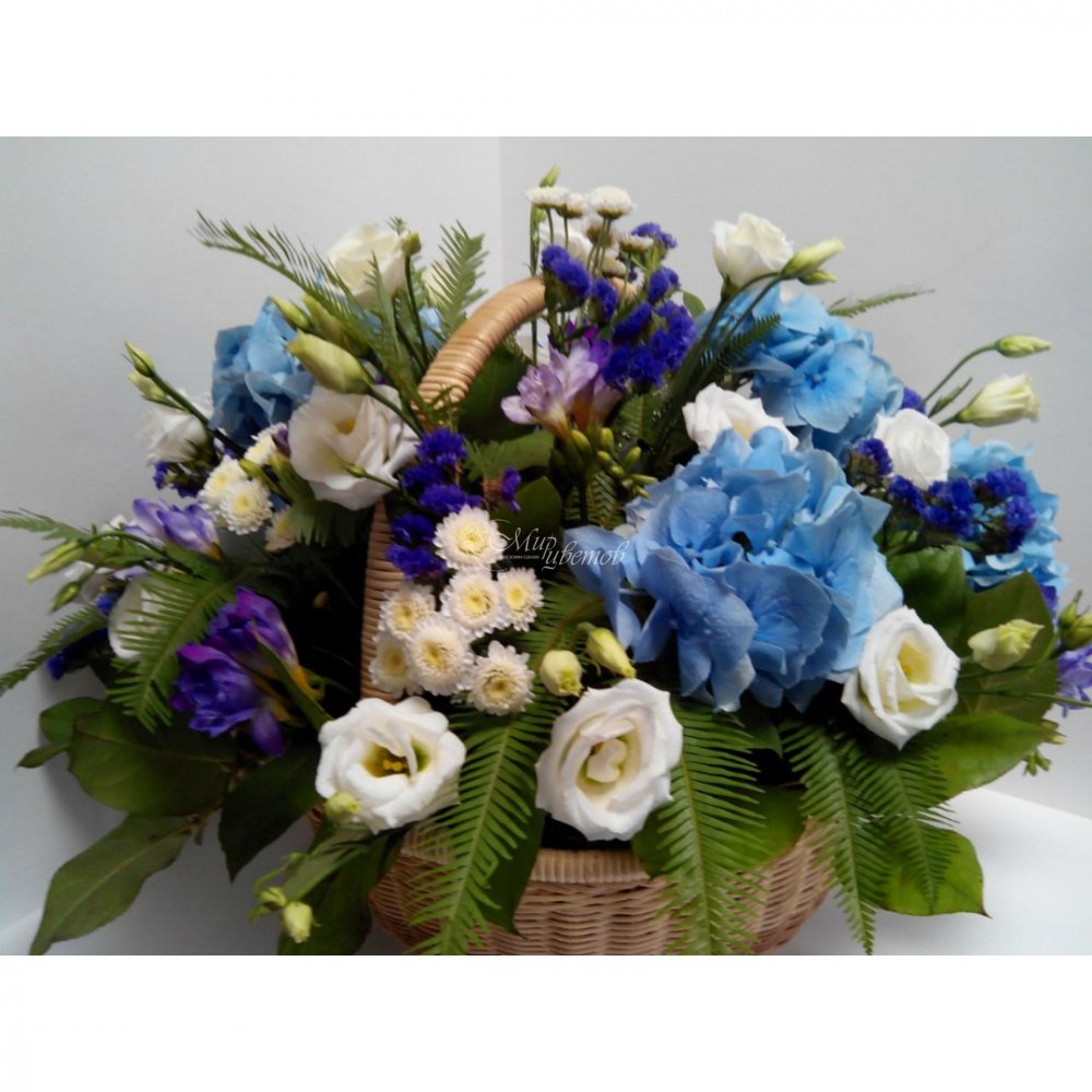 Корзина Гортензия -1 шт Эустома - 4 шт Статица - 2 шт Хризантема куст - 3 шт Фрезия - 7 шт Салал Умбрела