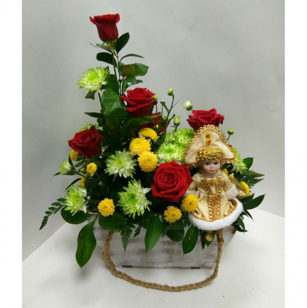 Кукла из фарфора (можно заменить любой другой игрушкой) Ящик Роза Хризантема кустовая Салал Зелень
