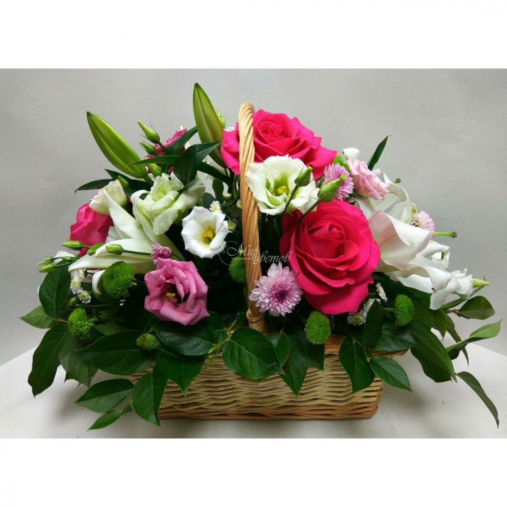 Корзина - 1шт Роза - 3 шт Эустома - 3 шт Лилия - 1 шт Хризантема кустовая - 3 шт Зелень Цветы в композиции могут быть заменены на равноценные, по усмотрению флориста.