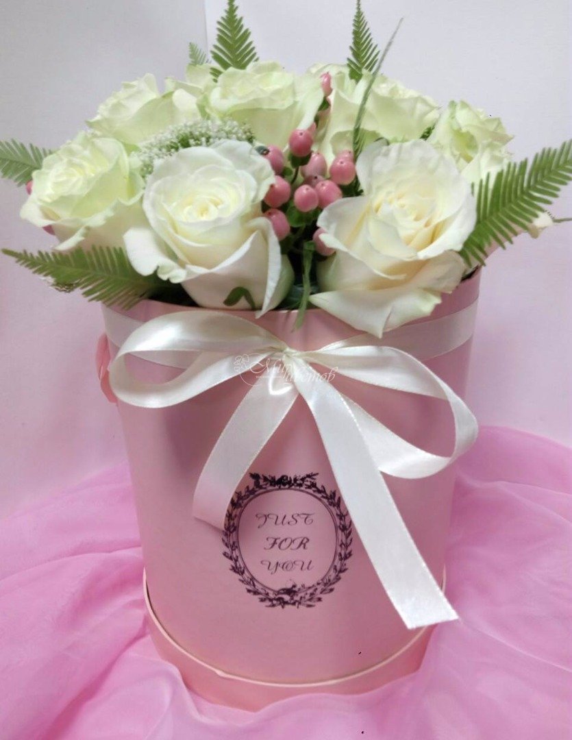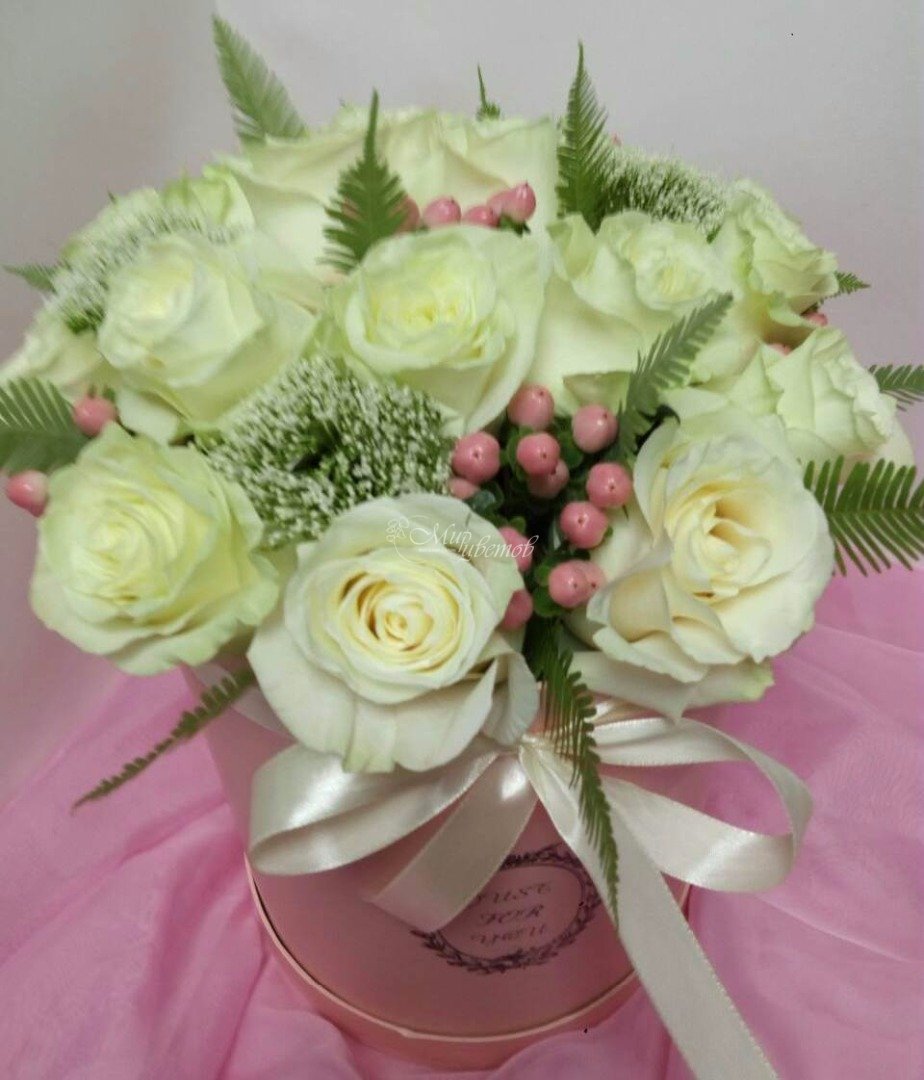 Шляпная коробка Роза белая - 15 шт Гиперикум - 3 шт Умбрела - 2 шт