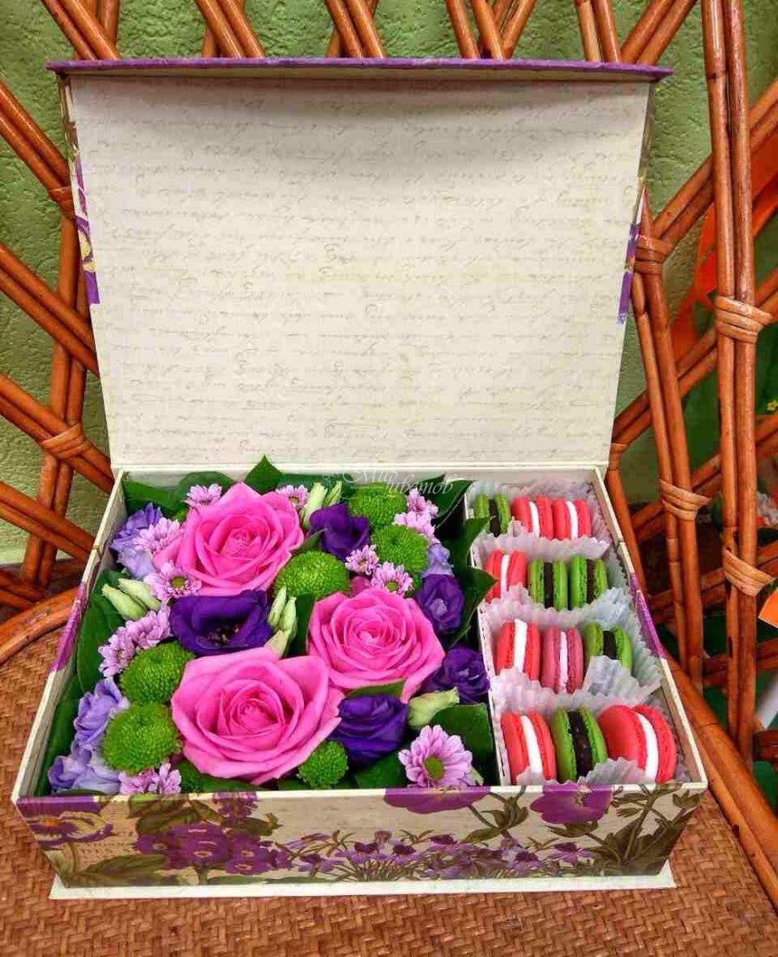 Коробка Макаруны Роза Эустома Хризантема Зелень