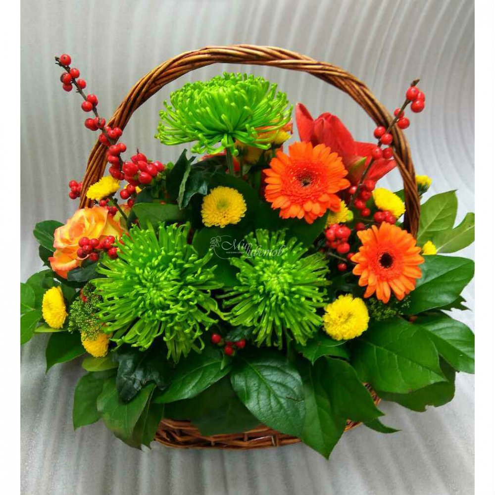 Корзина Илекс Амарилис Роза Хризантема Хризантема кустовая Гербера Зелень