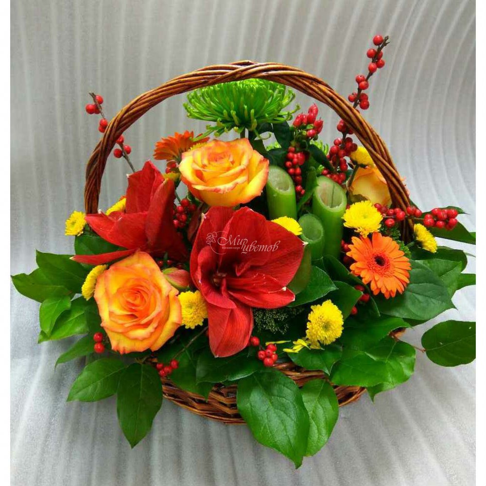 Корзина - 1 шт Амариллис - 2 шт Гербера - 3 шт Хризантема кустовая - 3 шт Верон - 3 шт Зелень Цветы в композиции могут быть заменены на равноценные, по усмотрению флориста.