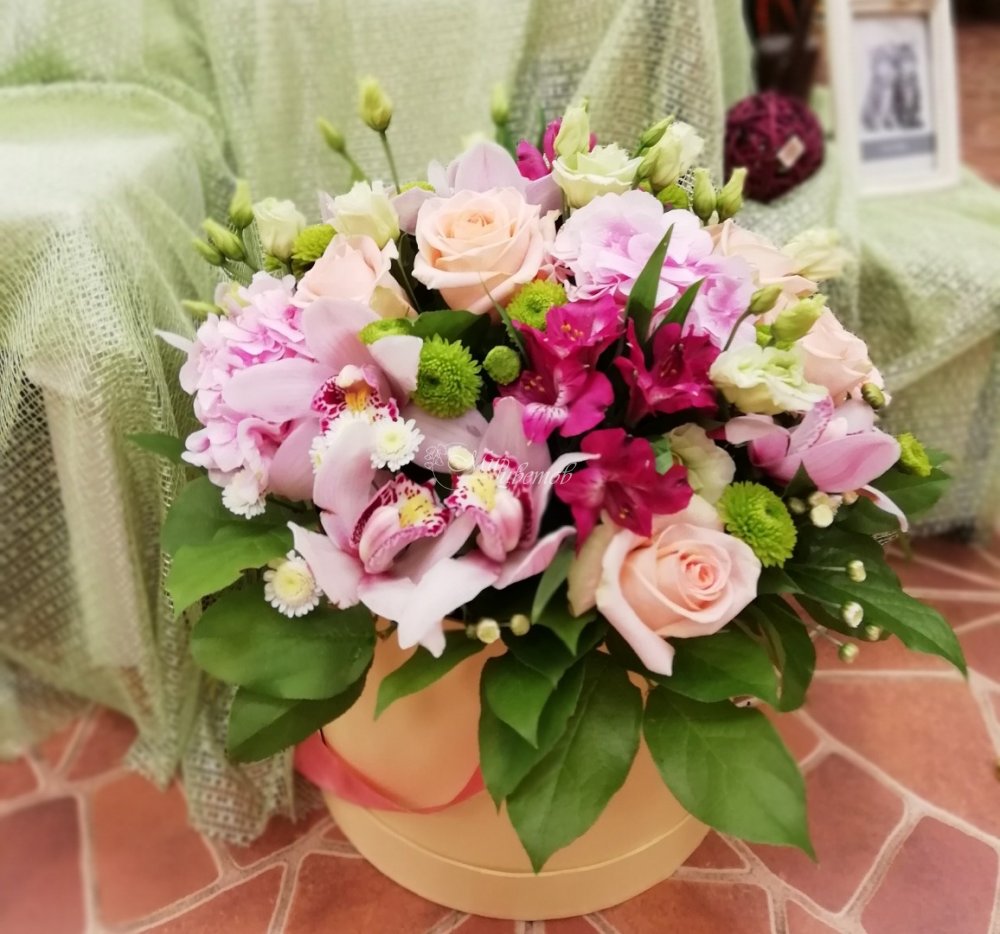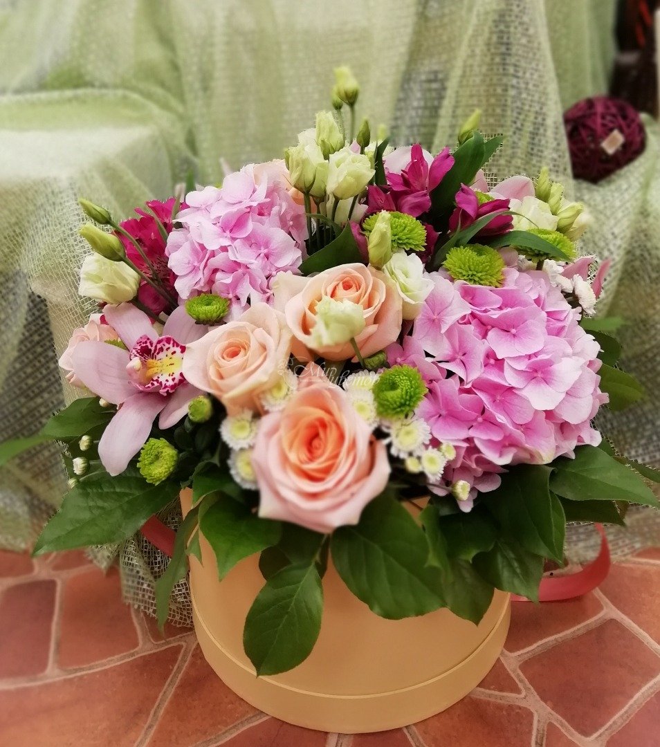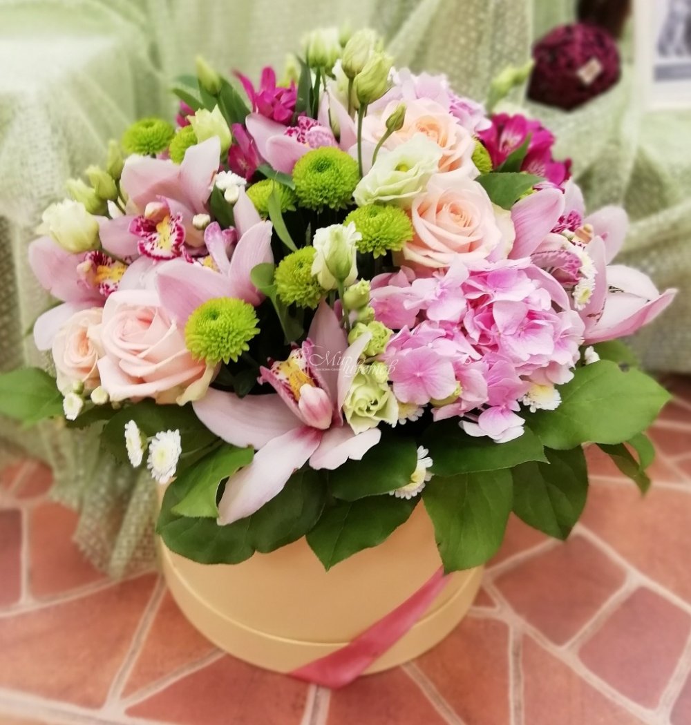 Коробка Розы эустома альстромерия гортензия цимбидиум зелень